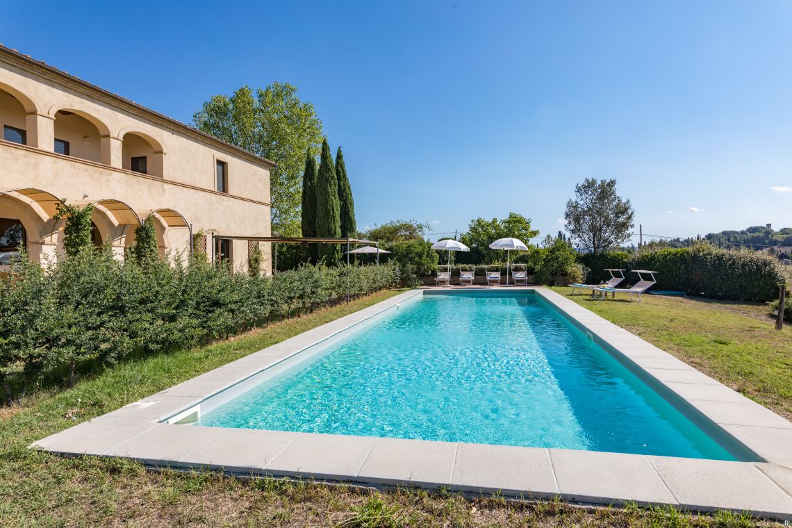 Located in the rich agricultural countryside above the unspoilt valley of the Ombrone River, uninterrupted views of nearby vineyards, distant farmhouses and castles can be enjoyed. Buonconvento, the nearest town (only 4k), provides for all needs. Siena is 29k to the north on the 'Via Cassia', the ancient Consular Roman road. The Villa was designed and built just a few years ago by the Anglo-Italian owners, also architects, with in mind a contemporary version of a classical Tuscan Villa, using traditional materials with a modern approach to layout and details. The old and new, ethnic furniture and paintings found in the villa are part of the family heritage.