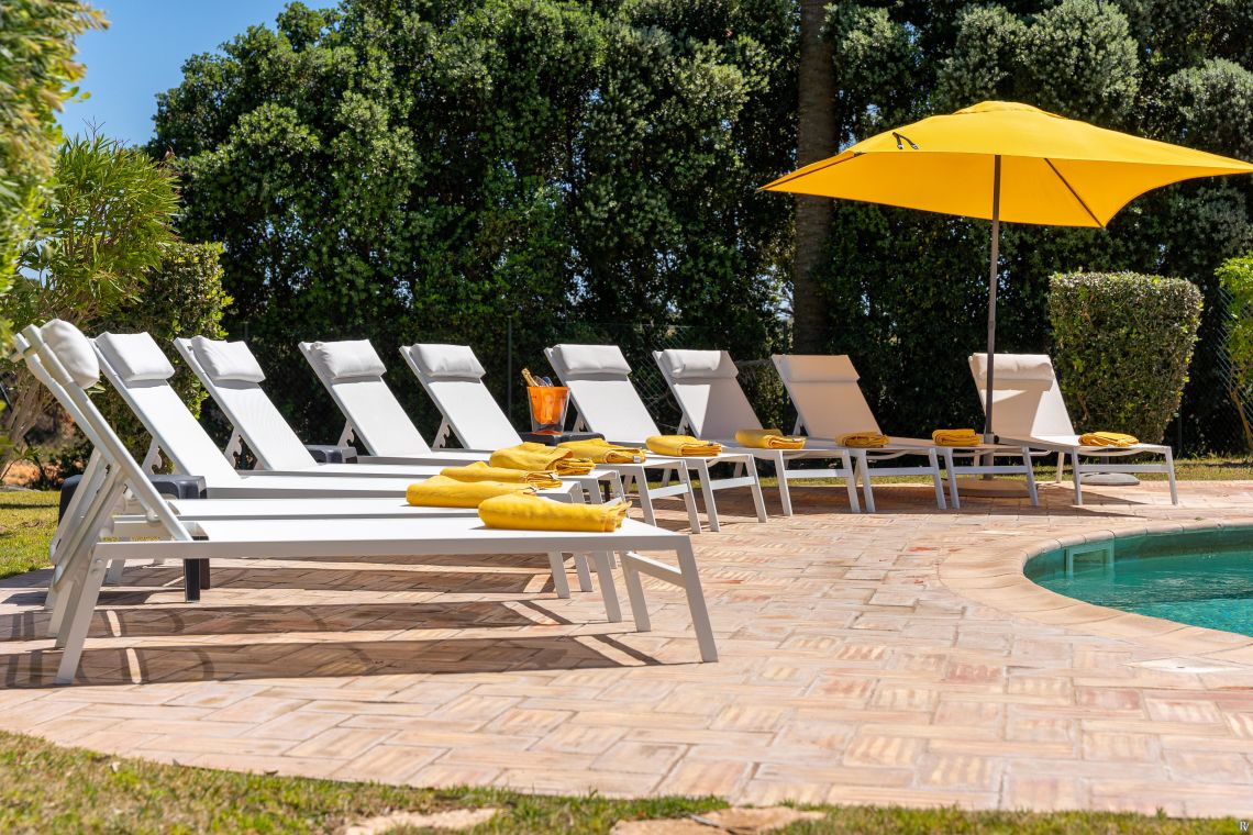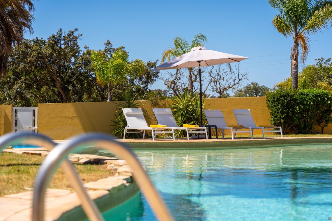 Set within beautifully landscaped private gardens featuring vineyards, olive trees, and lemon groves, Monte da Poupa offers panoramic countryside views in a peaceful Algarve setting. At the heart of the property is a large free-form private swimming pool surrounded by palm trees, sun loungers, and shaded seating areas.