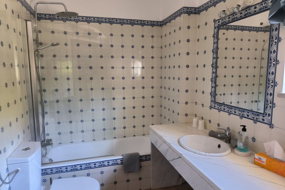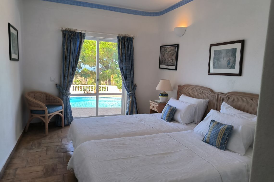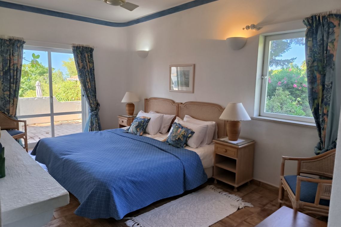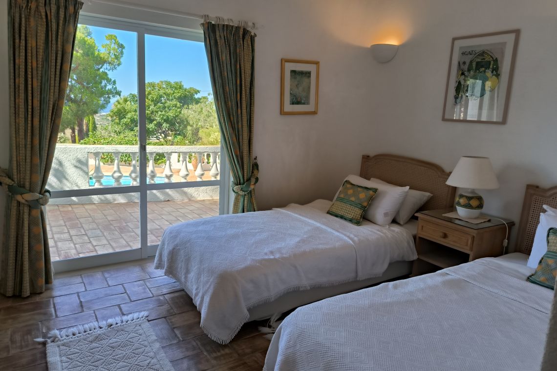All four bedrooms are located on the ground floor, offering cool spaces for rest. The villa features two twin bedrooms and two king-size bedrooms, each with its own en-suite bathroom. All bedrooms have French doors opening onto a covered terrace, with direct access via steps to the pool area.