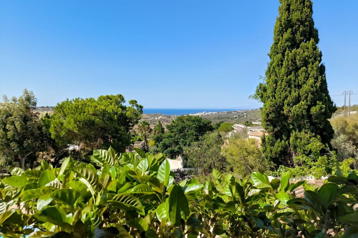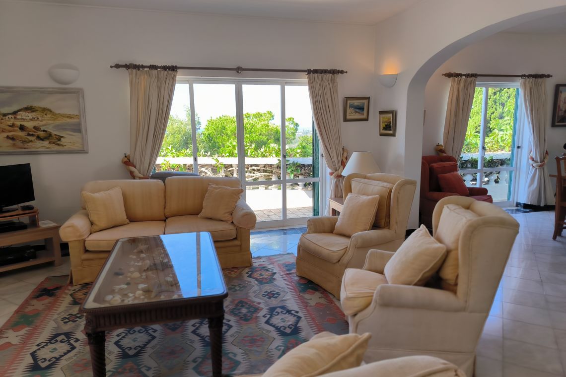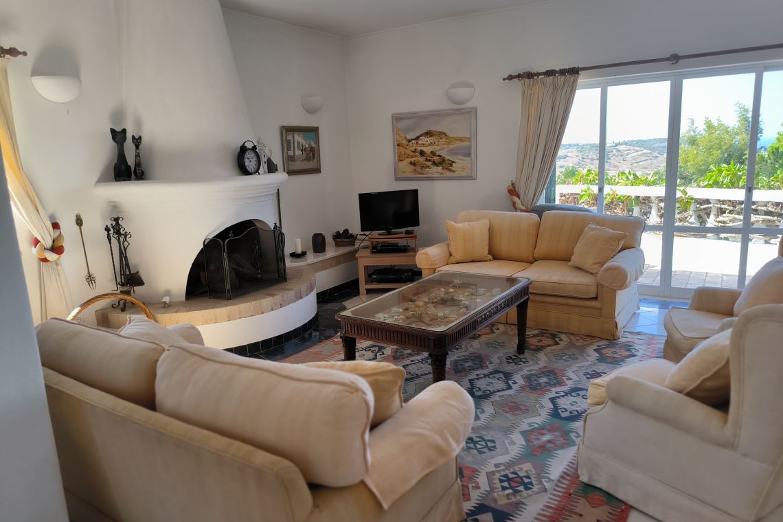 Entering the villa, a staircase leads to a bright and spacious open-plan living and dining area, beautifully styled with a Mediterranean-inspired palette. The dining table comfortably seats eight guests, and the lounge includes a flat-screen TV with UK and Portuguese channels, along with Wi-Fi throughout. French windows open onto a large upper terrace with spectacular sea views, while an additional cosy seating nook provides the ideal spot for morning coffee or evening drinks.