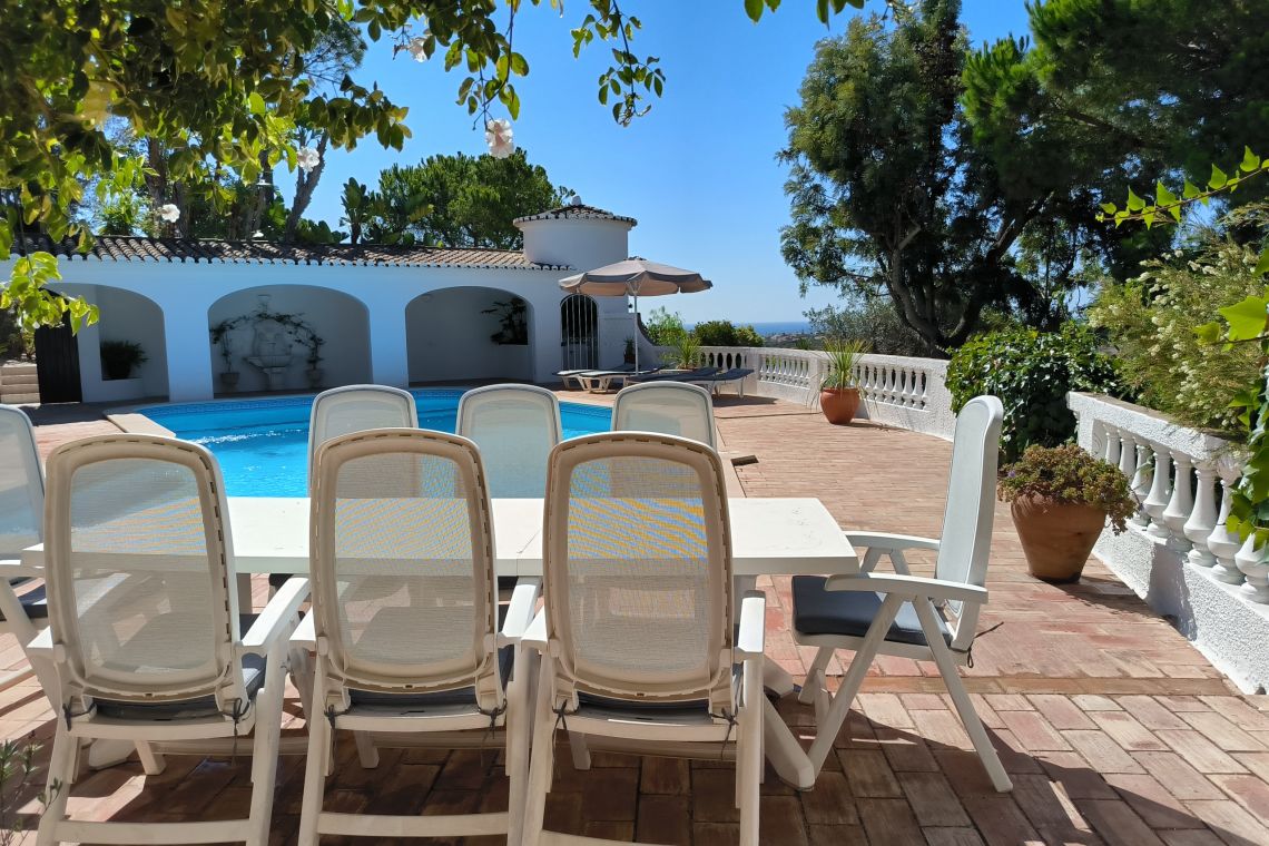 The outdoor areas at Casa Panoramico are designed for relaxation and entertaining, featuring a spacious private pool surrounded by sun loungers and shaded areas. A covered BBQ and dining space for eight guests creates the perfect setting for al fresco meals. The terraced gardens and multiple seating areas make the most of the stunning panoramic views, while outdoor lighting ensures a warm and inviting atmosphere into the evening.