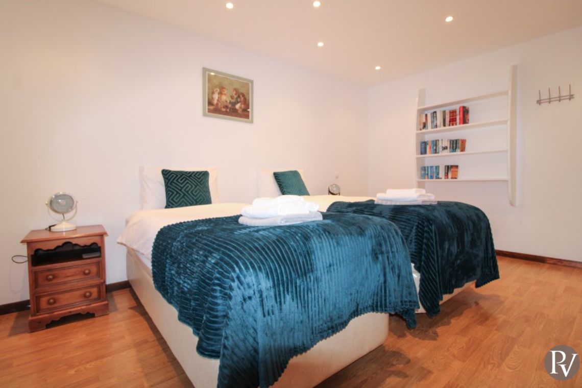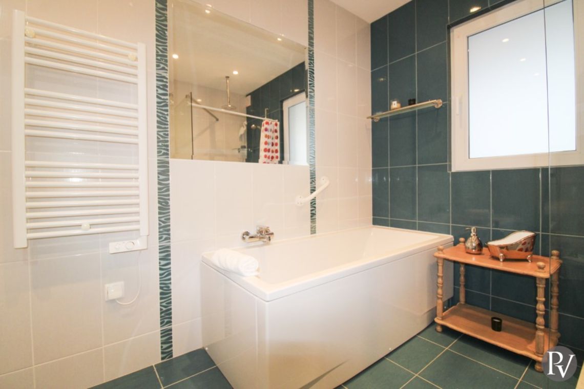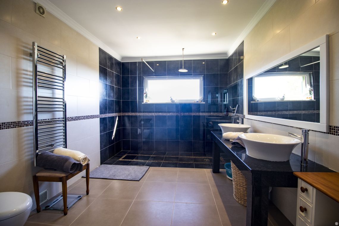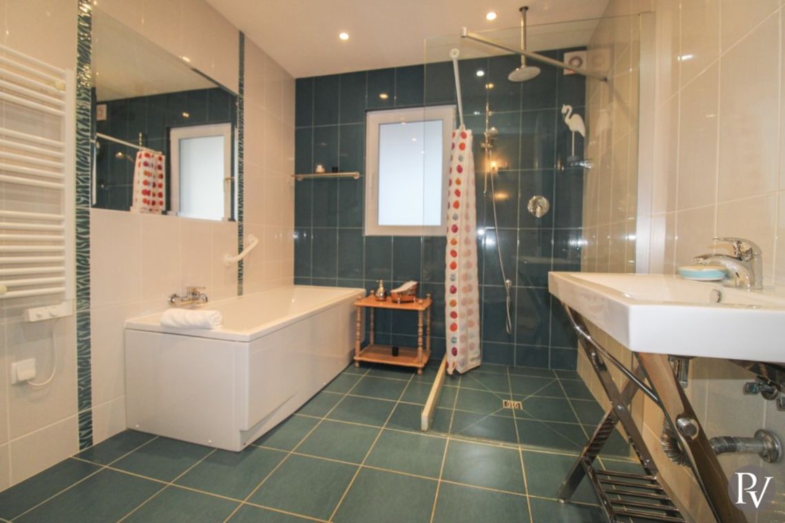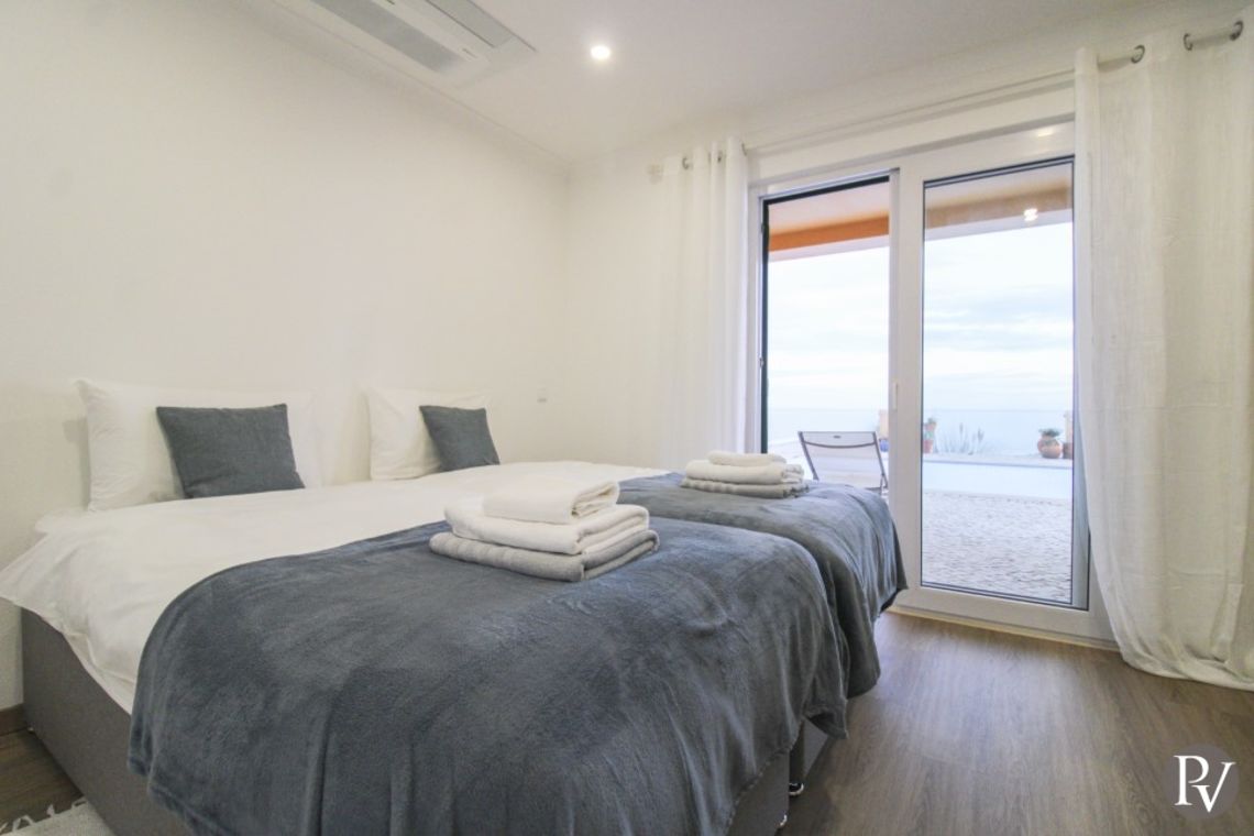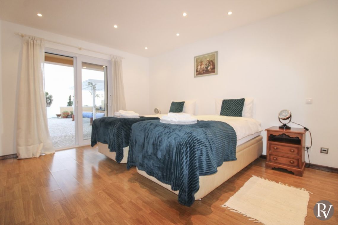 The master bedroom includes a private dressing area and en suite bathroom with a sea-view shower. On the lower ground floor, three bedrooms, each with patio doors to the pool area, offer beautiful sea views. The double bedroom has an en suite shower room, while the two twin bedrooms share a large family bathroom. The villa's location provides easy access to nearby beaches and local attractions, ensuring a perfect holiday experience.