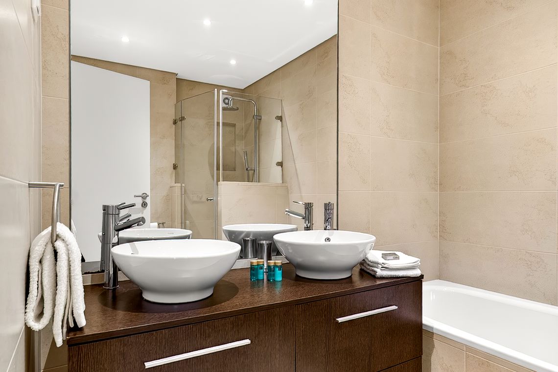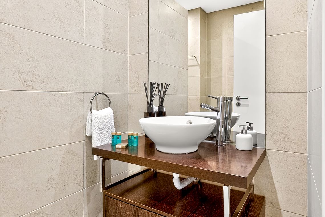 Apartment Petal features two well-appointed bedrooms. There is a twin bedroom with two single beds, ideal for children or friends. The property also includes a spacious master suite with a double bed and a private en-suite bathroom, complete with both a bathtub and a separate shower for added comfort.
