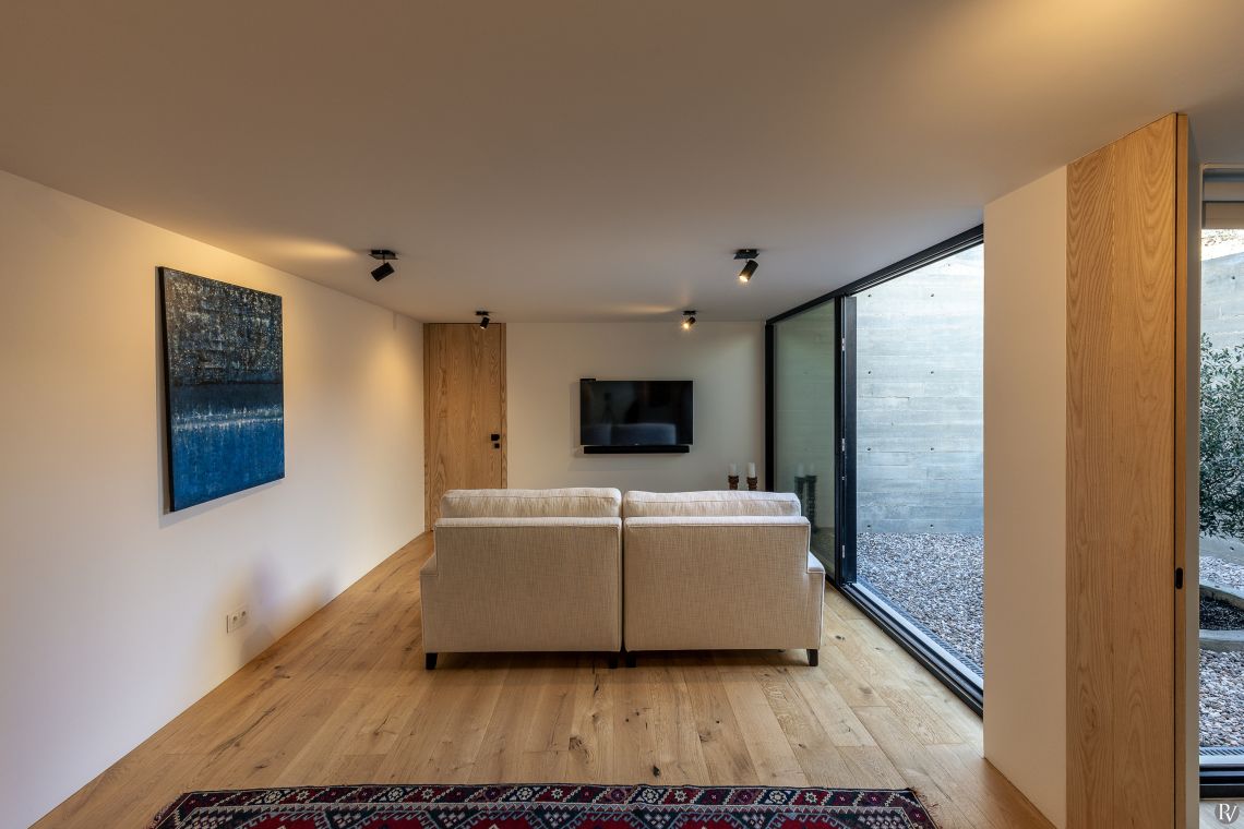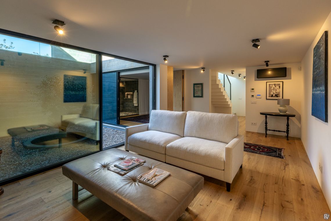 The lower ground floor includes an additional television and sitting area, along with a charming internal courtyard, offering a peaceful retreat within the home