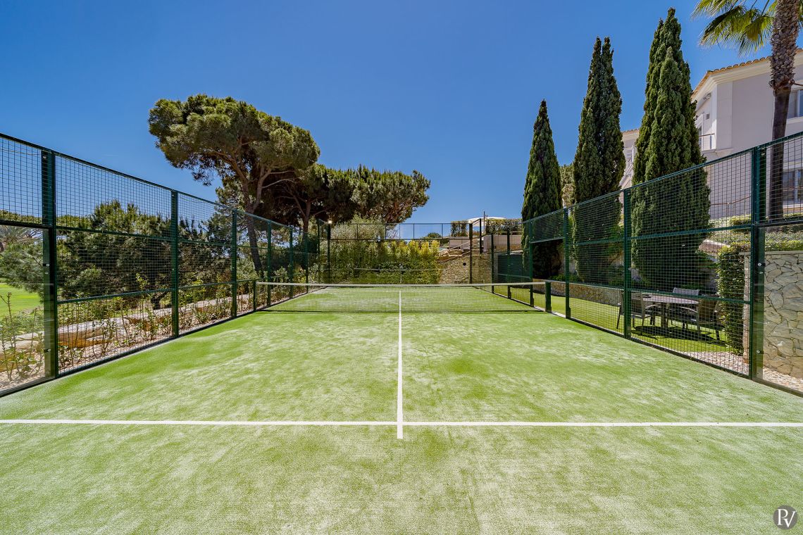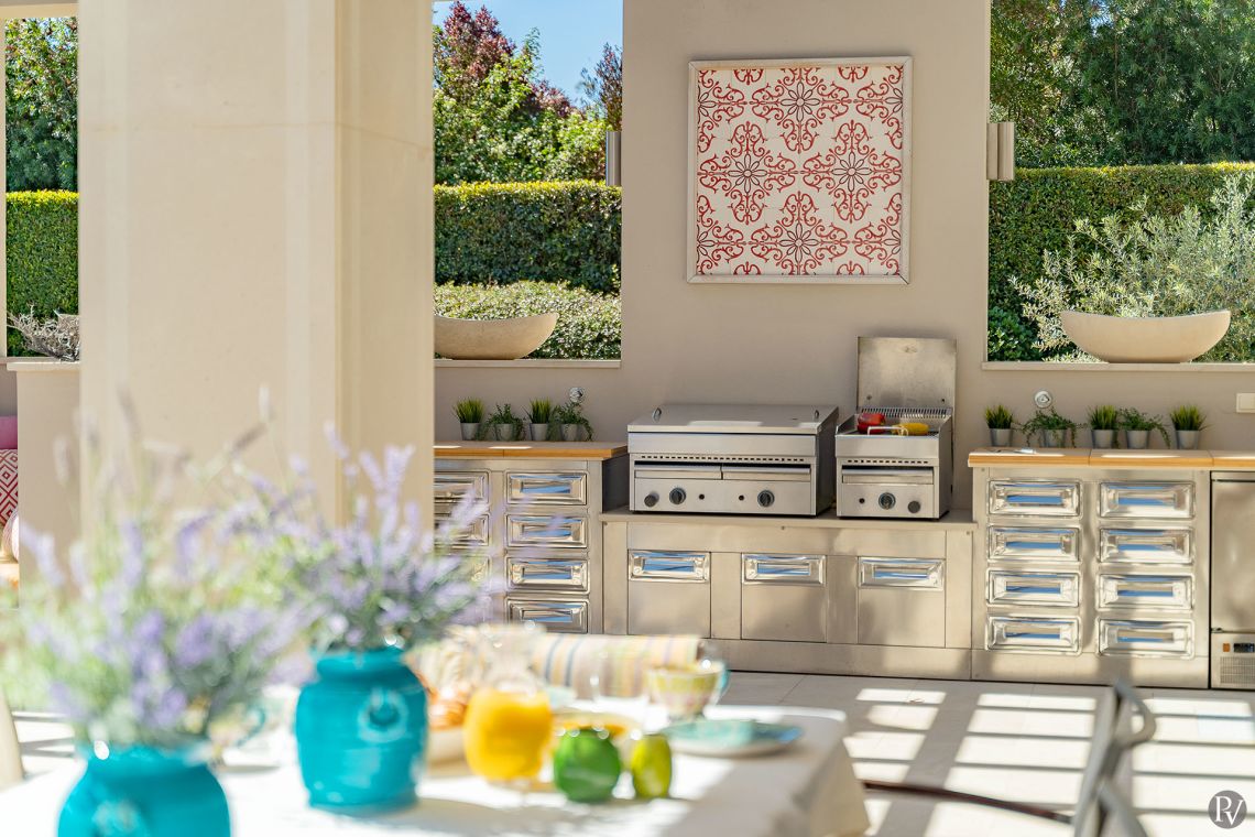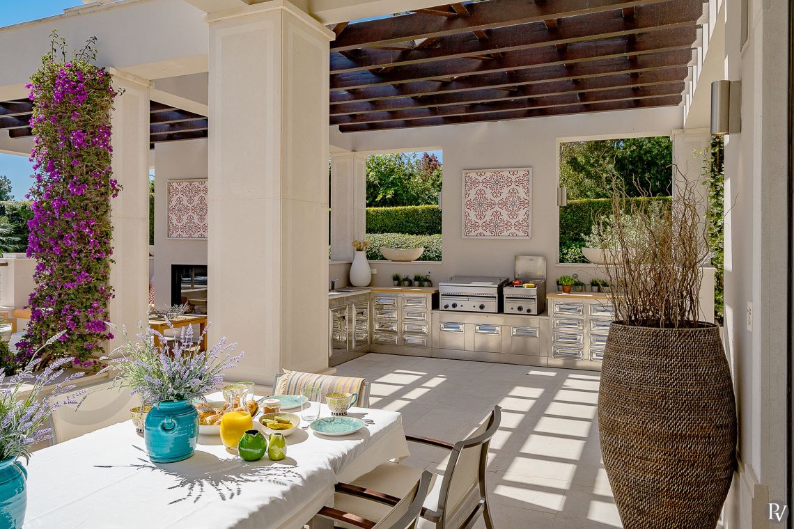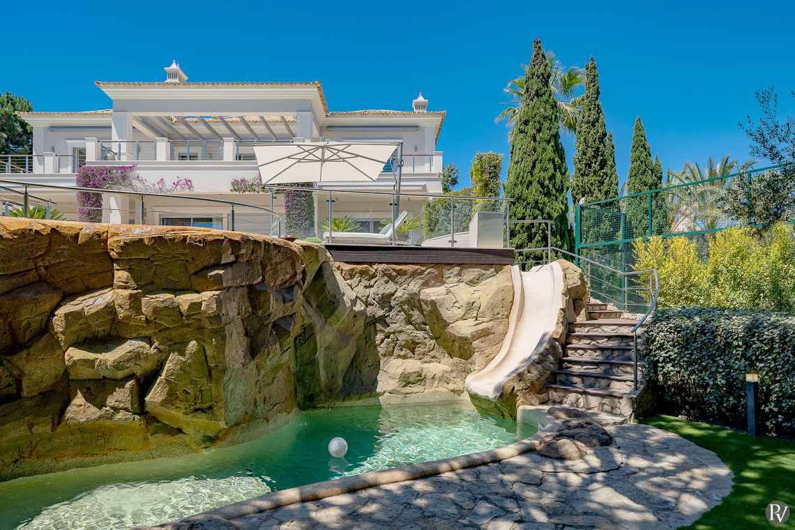 The magnificent exterior of Villa Marisa features a large private free style swimming pool with a slide to a plunge pool and cascade, a jacuzzi and a paddle court. There is also a beautiful “al-fresco” dining area, an outdoor kitchen with gas BBQ and fridge and numerous shaded lounging areas overlooking the golf course where you can relax and rest during the warm summer days.