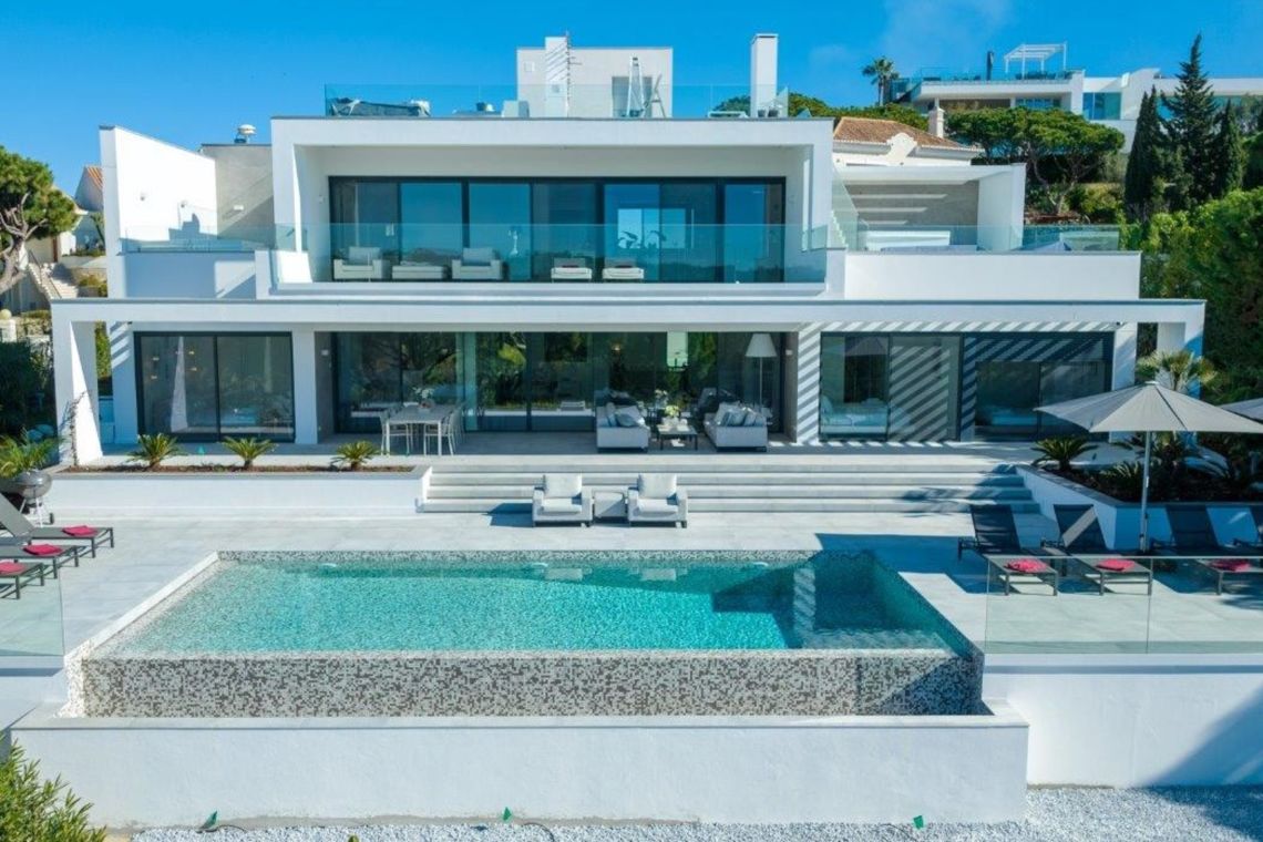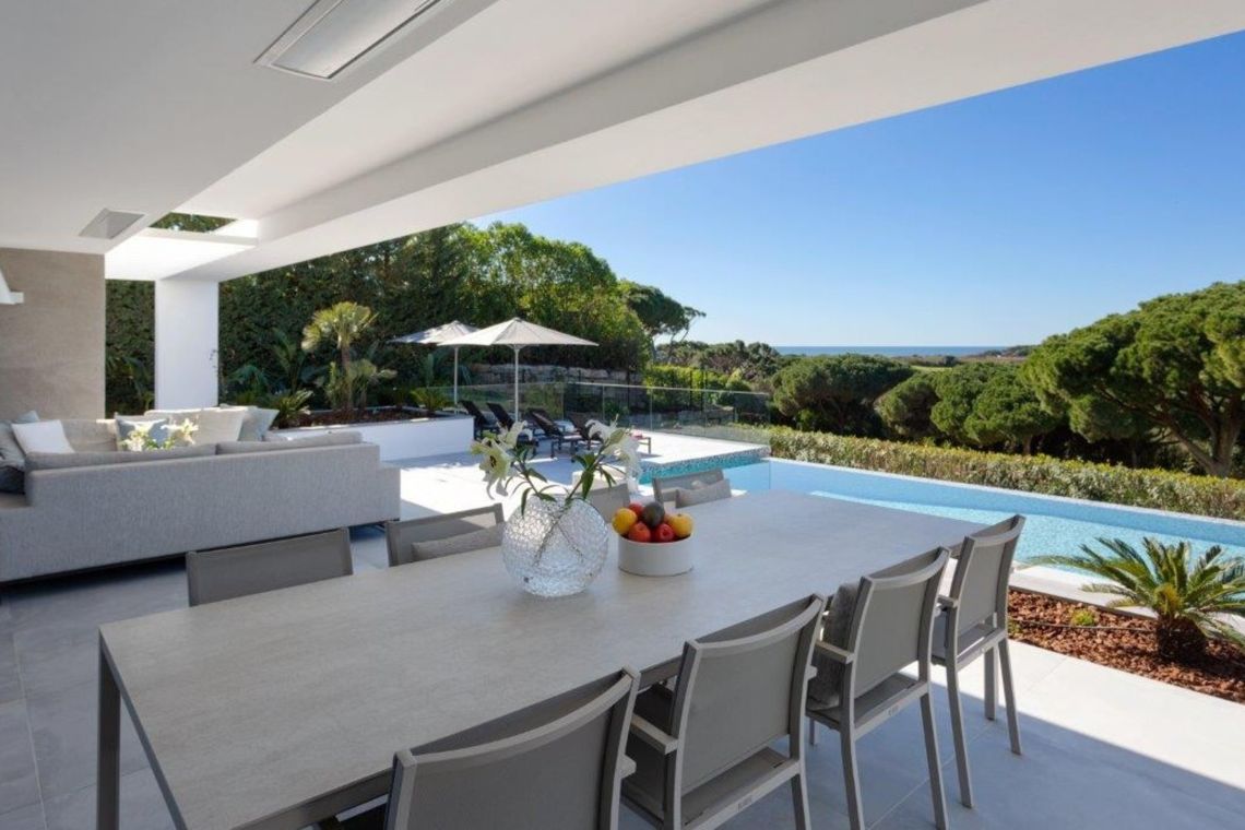 The first floor provides access to additional social spaces, including a terrace with lounge seating and a jacuzzi overlooking the pool, golf course, and sea. The rooftop terrace, accessible by stairs or lift, offers a stylish bar and seating area.