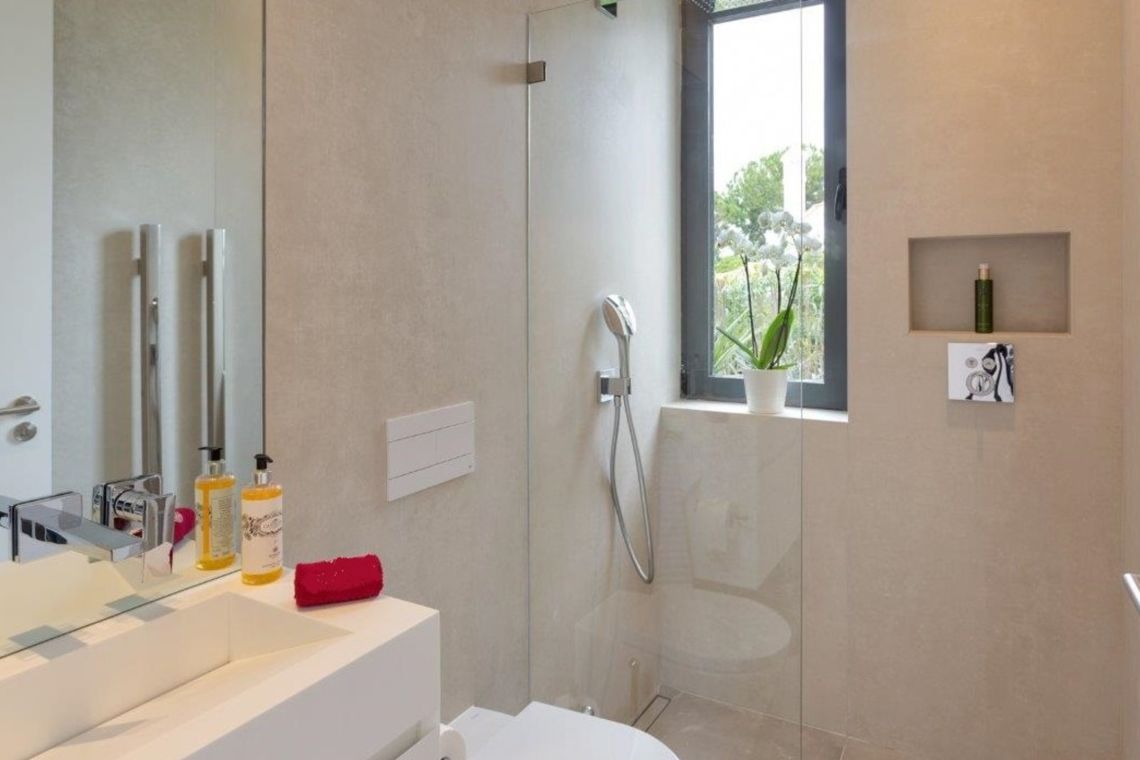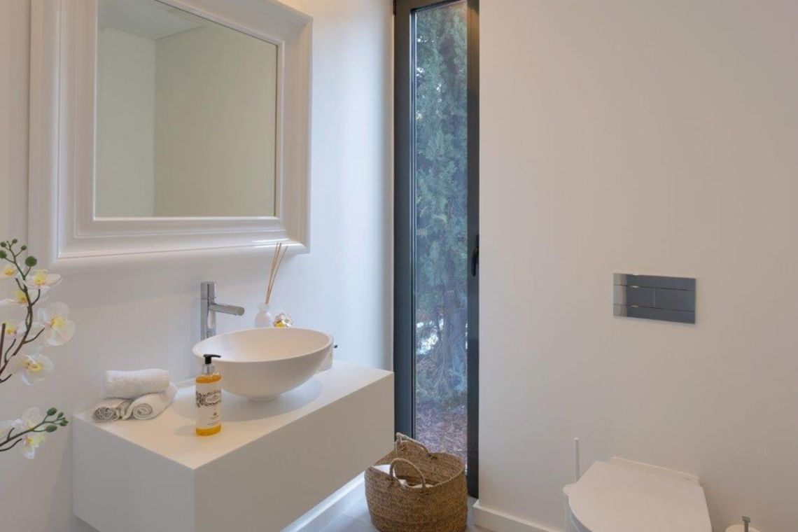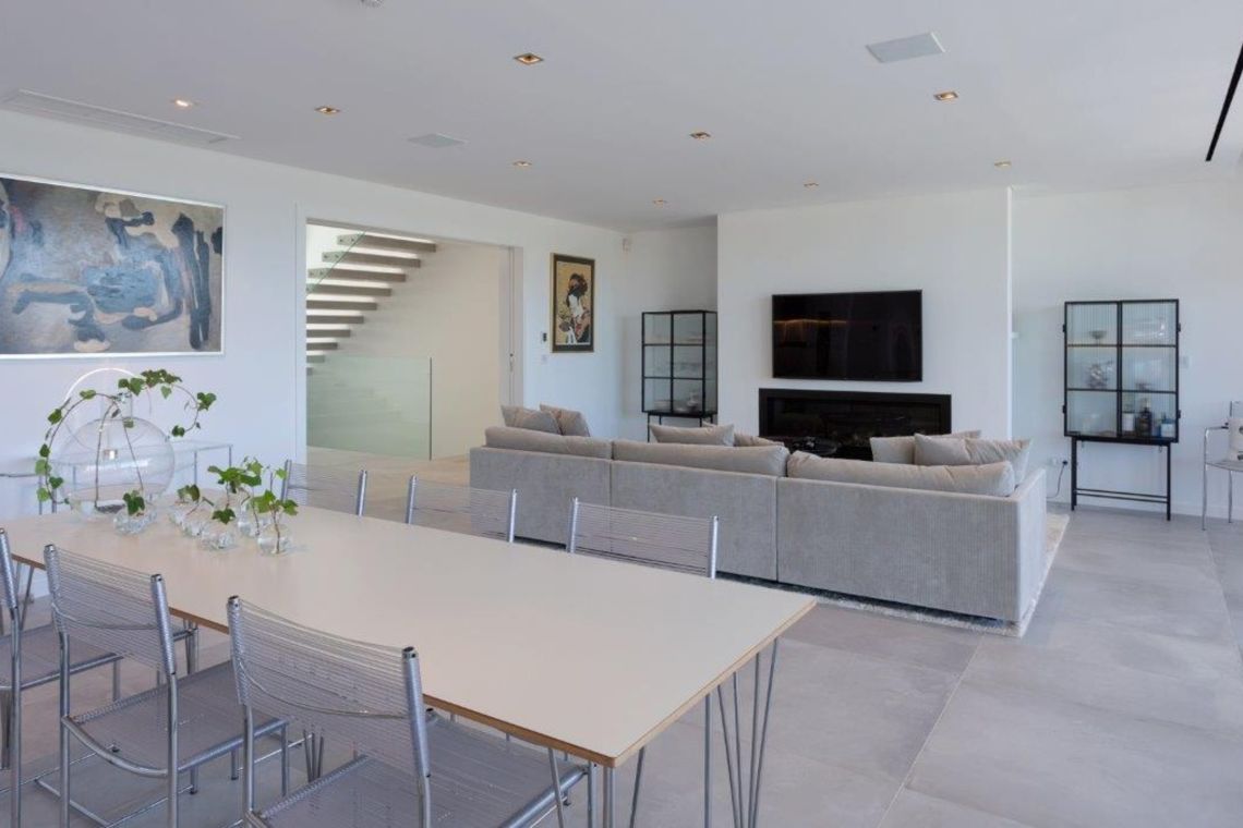 On the ground floor, an open-plan lounge features comfortable sofas, a feature fireplace, TV, and direct access to the pool terrace. The adjoining dining area and fully fitted kitchen are well equipped and also provide access to outdoor areas. A guest WC is located on this level.