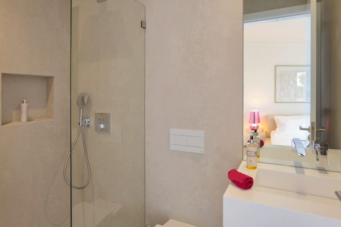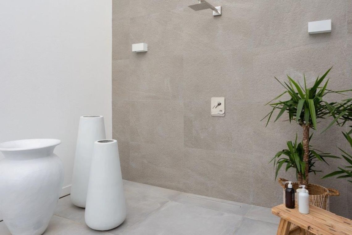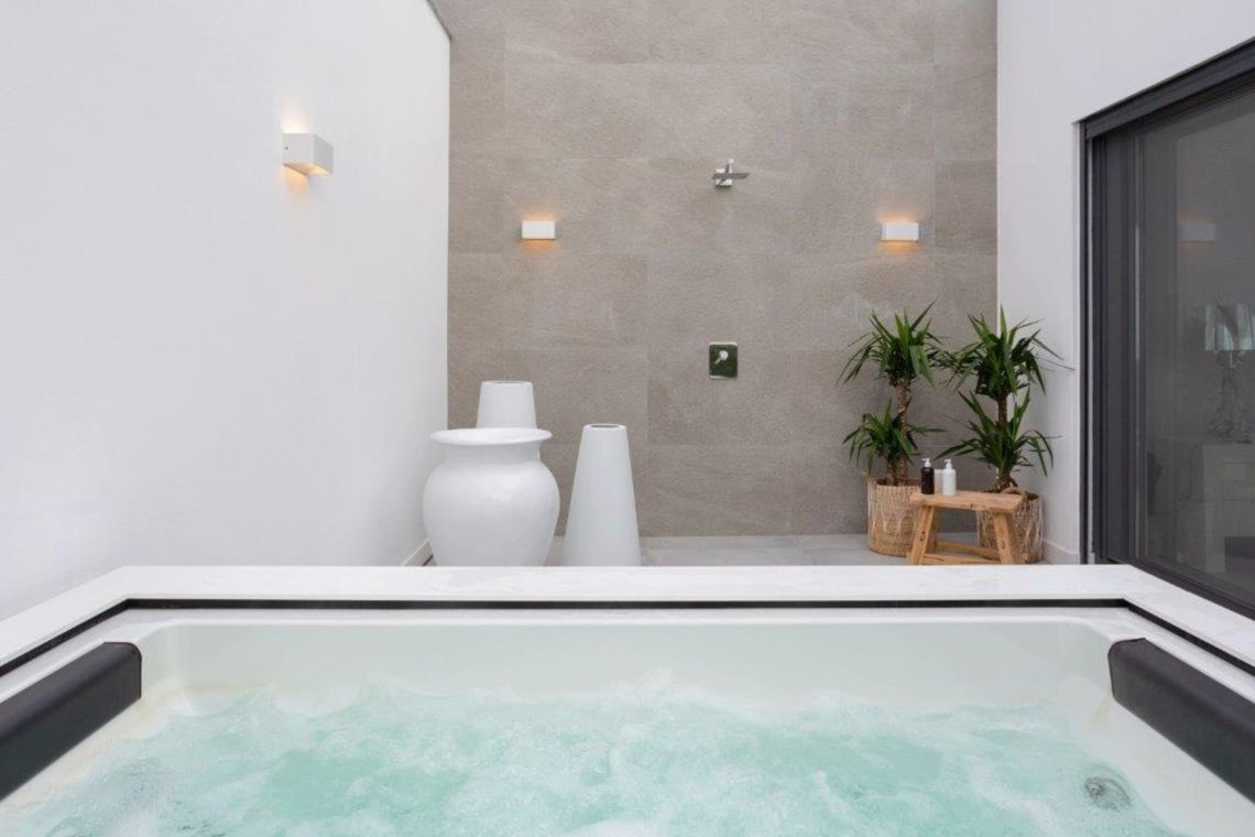 Bedroom 5 (First Floor – Master Suite): Double bed, walk-in wardrobe, ensuite bathroom, and access to a large private terrace with jacuzzi and outdoor shower