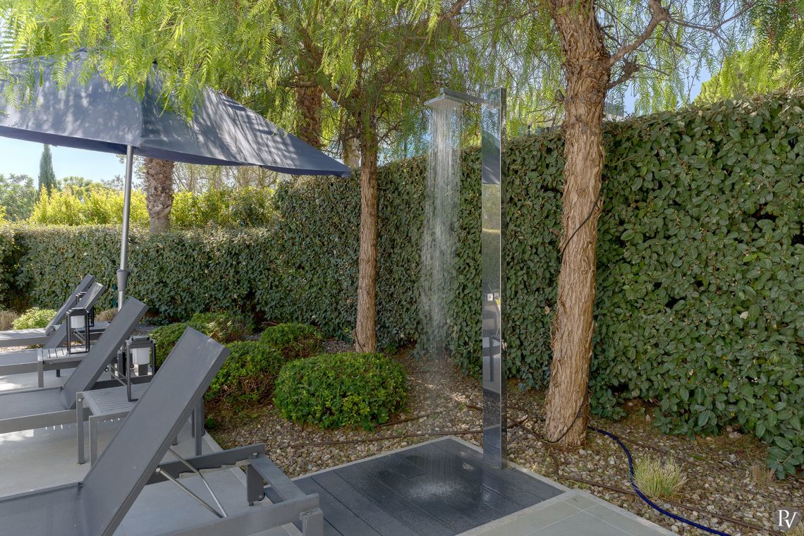 On the first floor there is the master suite, with walk-in shower and access to two private terraces, one of which overlooks the pool terrace.