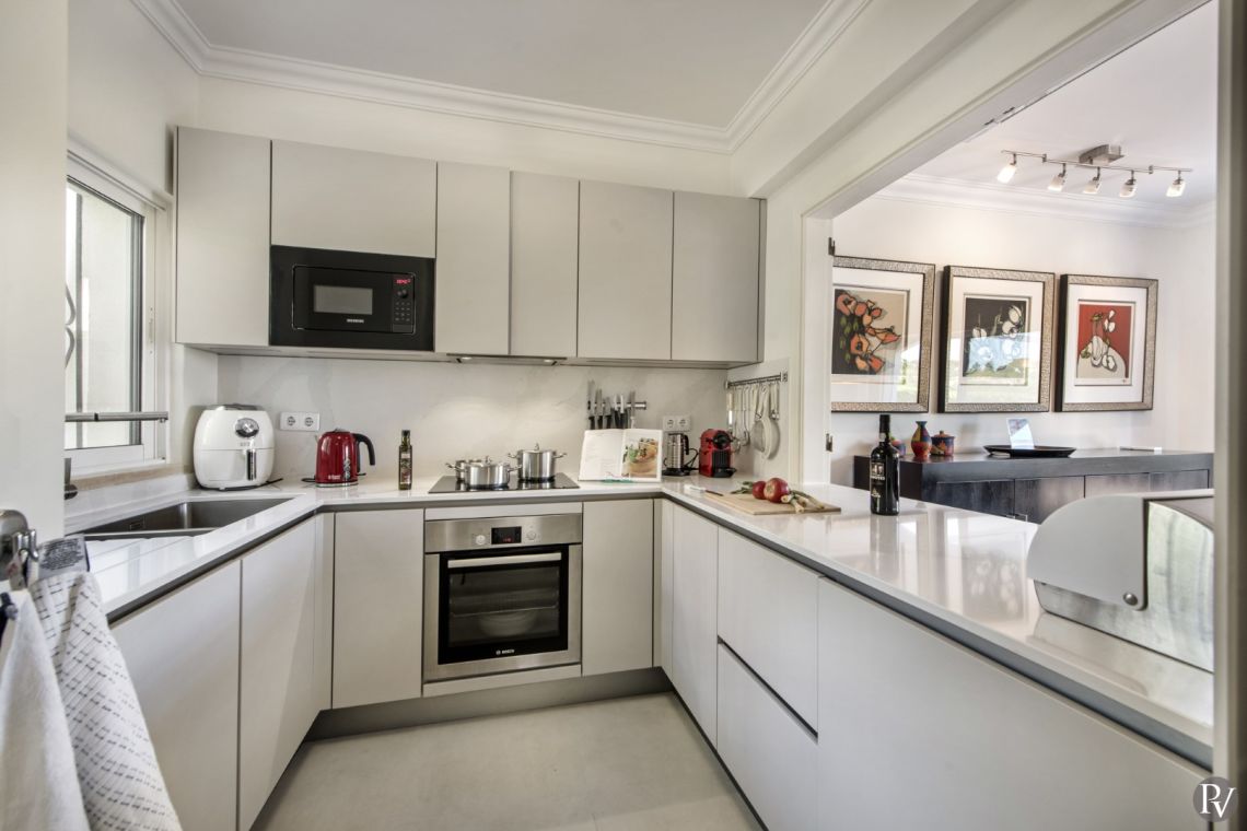The fully equipped kitchen includes modern appliances such as a coffee machine, microwave, dishwasher and washing machine, along with a convenient serving hatch.