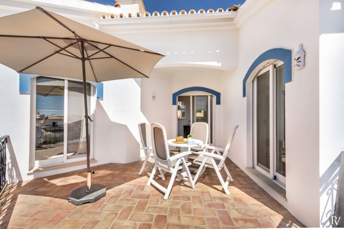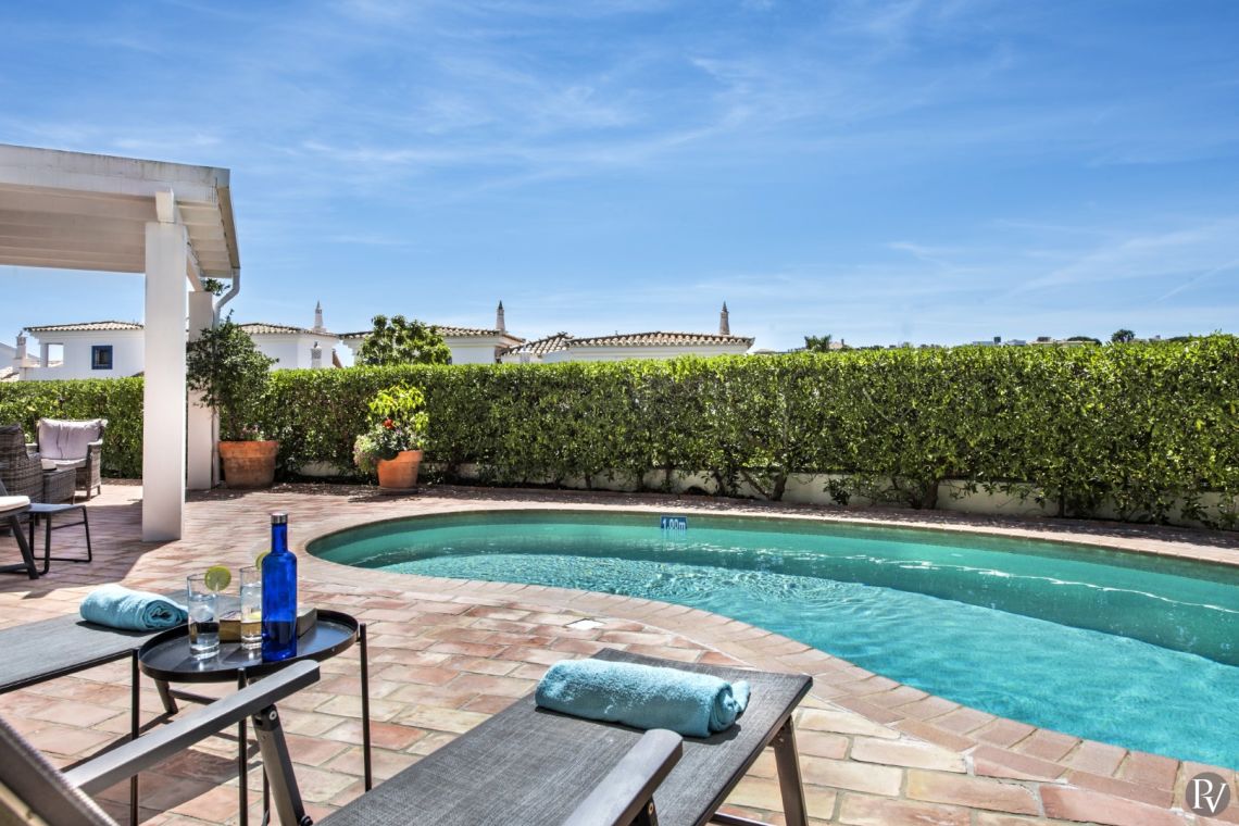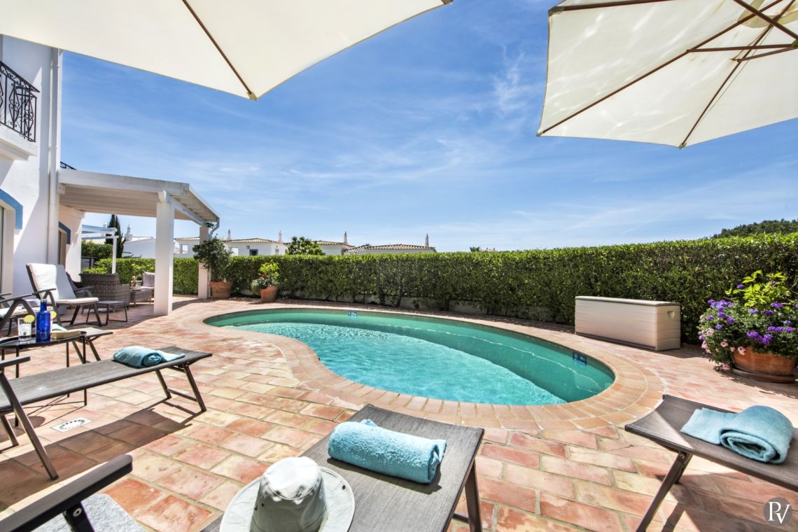 The villa features a lovely private pool area and patio, complete with outdoor furniture including sofas, a dining table and chairs, and sun loungers—ideal for relaxing in the Algarve sunshine. A mobile BBQ is also available for outdoor dining.