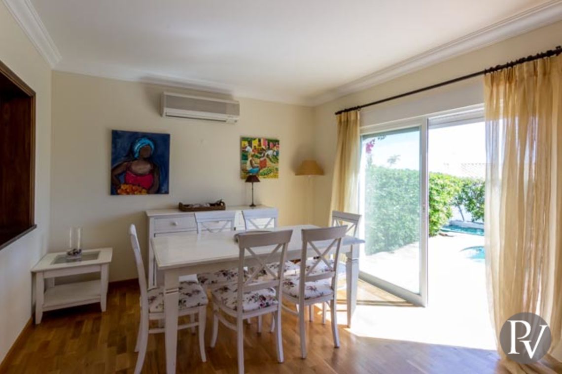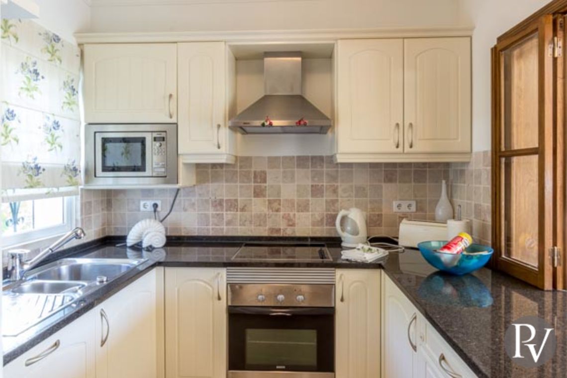 The ground floor features a bright and airy open-plan living and dining area, tastefully decorated for a relaxed and welcoming feel. Patio doors lead directly to the poolside terrace, creating an easy indoor-outdoor flow. The fully equipped kitchen provides all the essentials for a self-catering stay. Additional features include Wi-Fi, cable TV in all rooms, and optional air conditioning (available at an extra cost). Security is available 24/7, and cleaning is provided twice weekly.