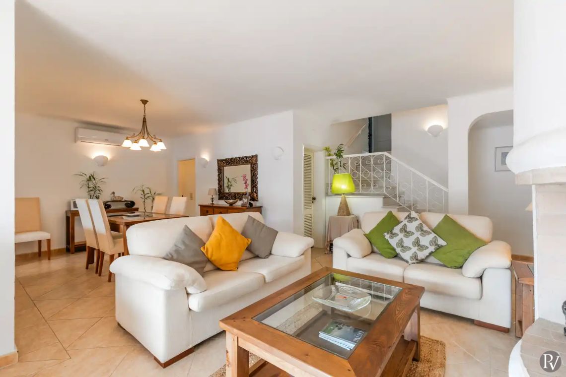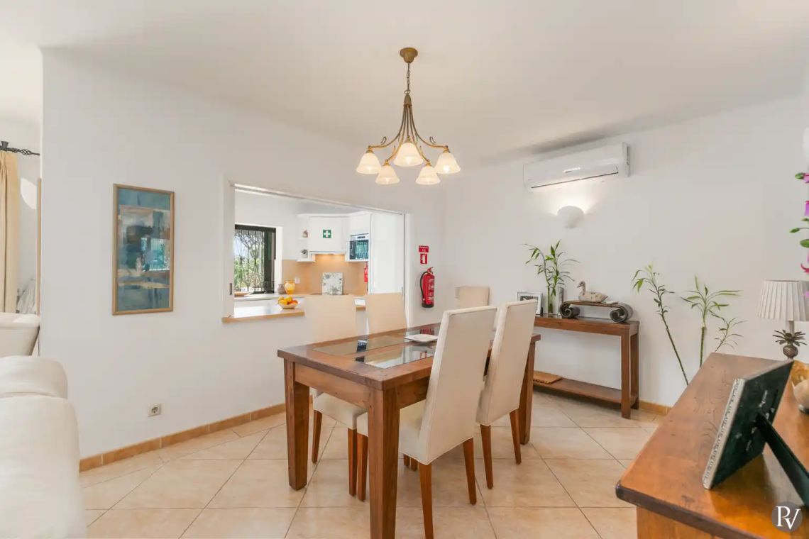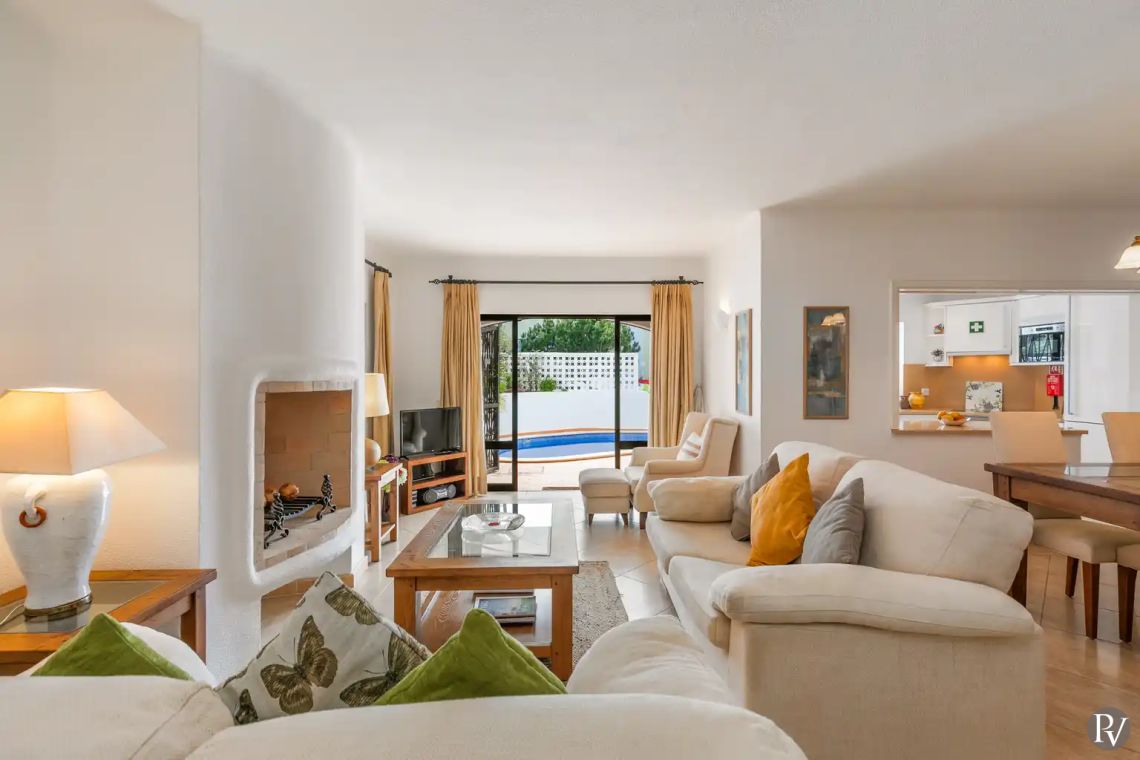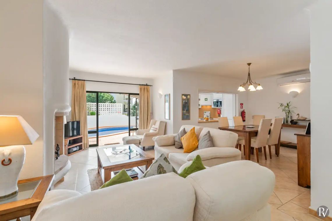 The outdoor area offers the perfect space for relaxation and entertainment, featuring a sun-drenched terrace with comfortable loungers and a sparkling pool. Patio doors open out to the terrace and pool area, creating a seamless flow between indoor and outdoor living — ideal for enjoying long, lazy days in the Algarve sunshine.