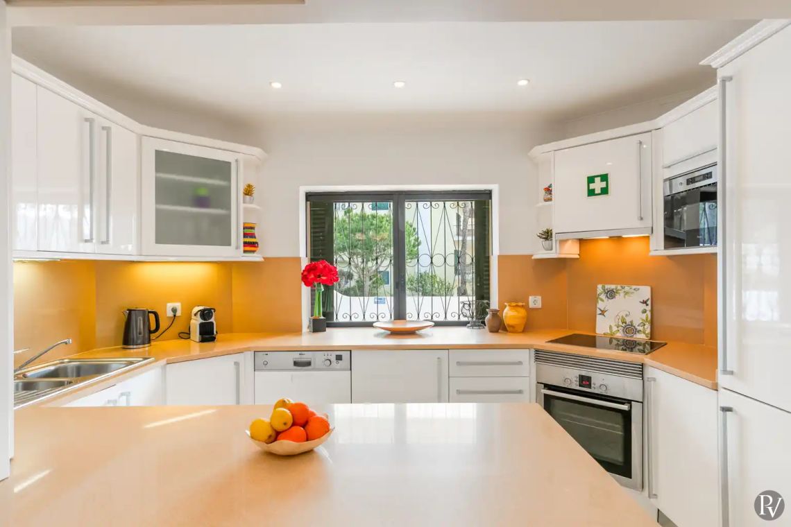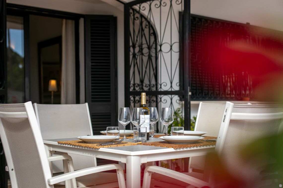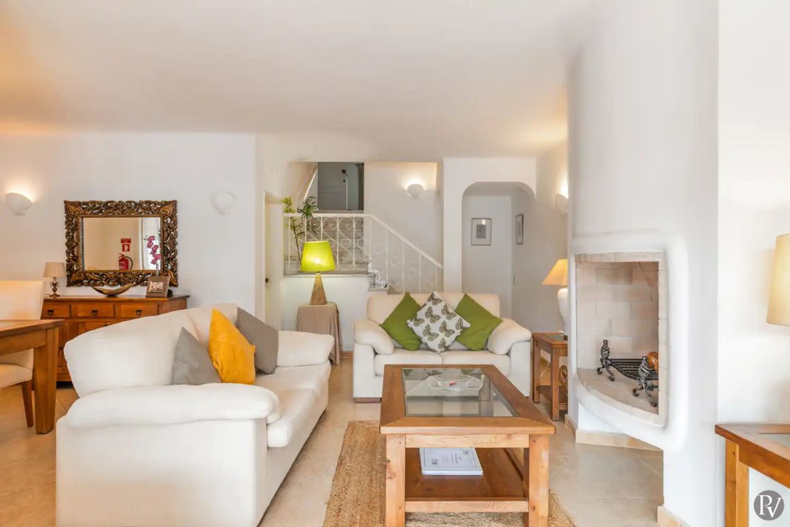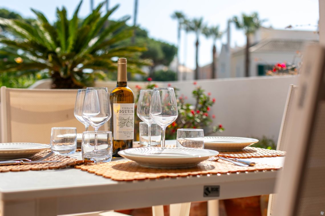 The outdoor area offers the perfect space for relaxation and entertainment, featuring a sun-drenched terrace with comfortable loungers and a sparkling pool. Patio doors open out to the terrace and pool area, creating a seamless flow between indoor and outdoor living — ideal for enjoying long, lazy days in the Algarve sunshine.