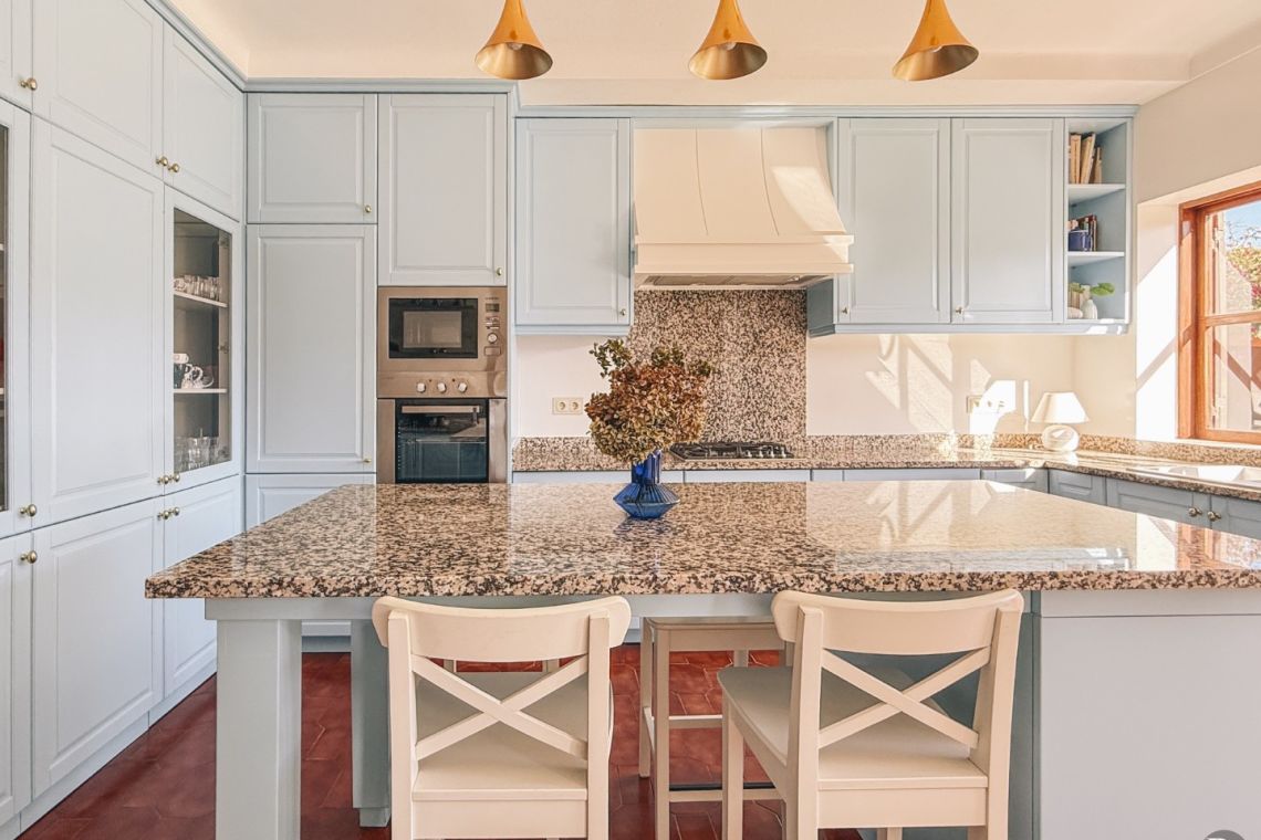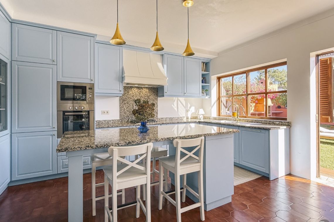 The fully equipped kitchen includes a central island, a separate laundry area, and direct access to the pool and barbecue space, making it both practical and sociable.