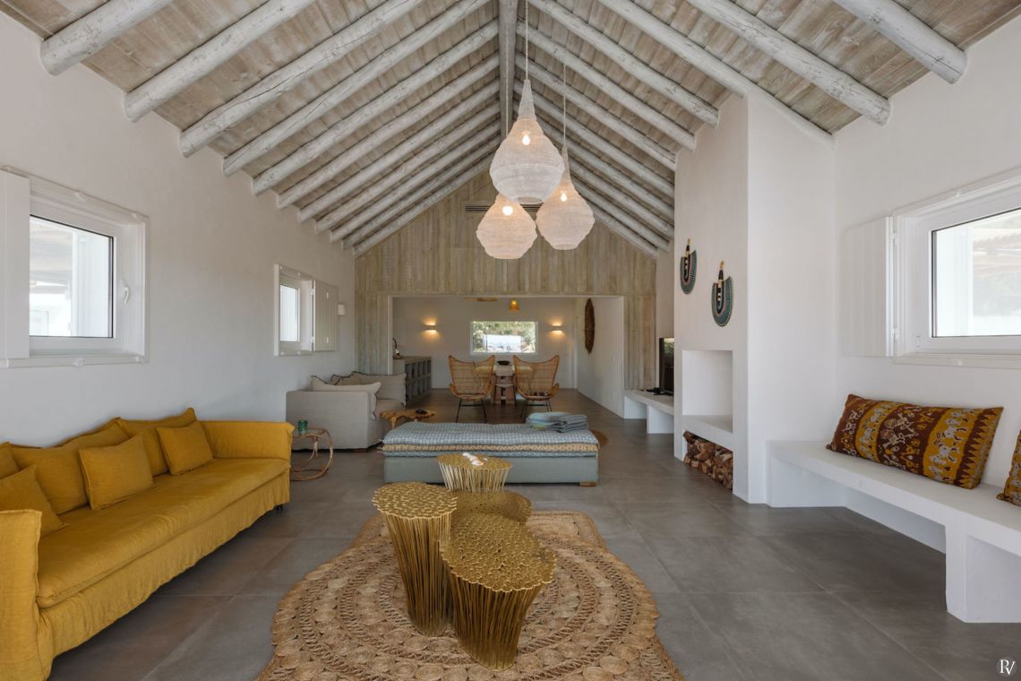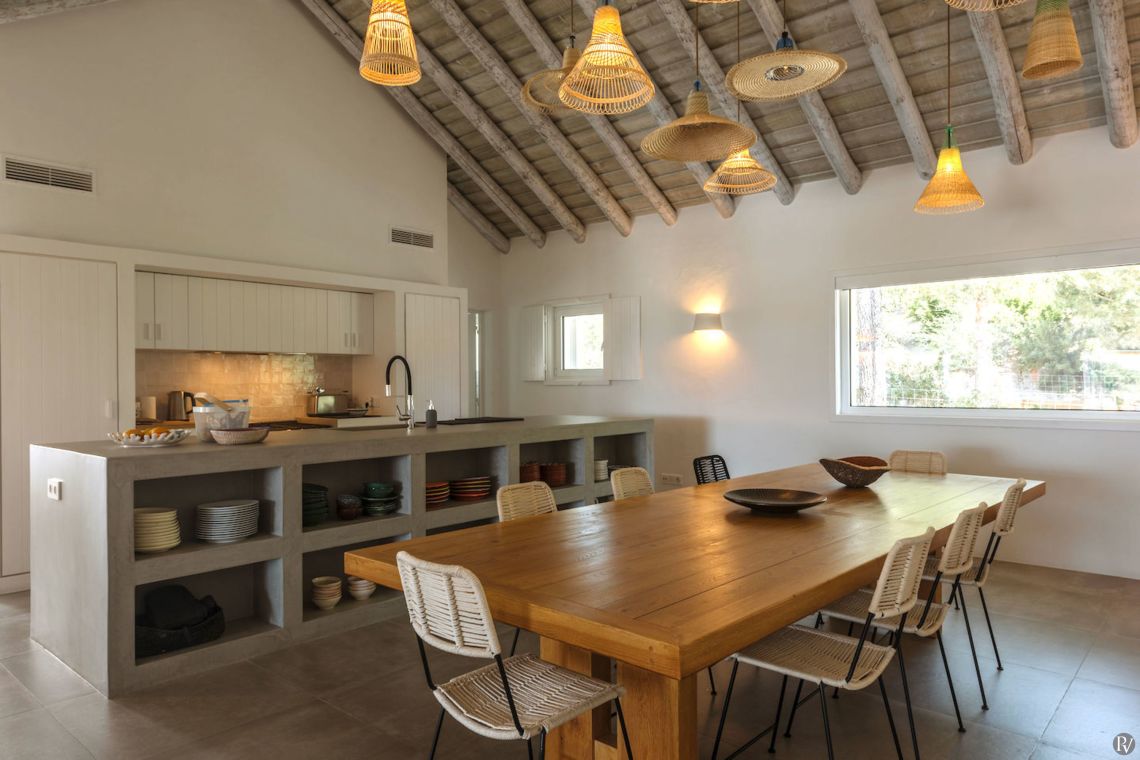 Set within an expansive plot, the property is surrounded by beautifully maintained gardens dotted with pine trees and natural sand dunes, with a long swimming pool at its heart that enhances the sense of calm and openness. The accommodation is thoughtfully arranged across three separate buildings, connected by wooden pathways and sunlit terraces, creating a harmonious balance of privacy and indoor outdoor living.
