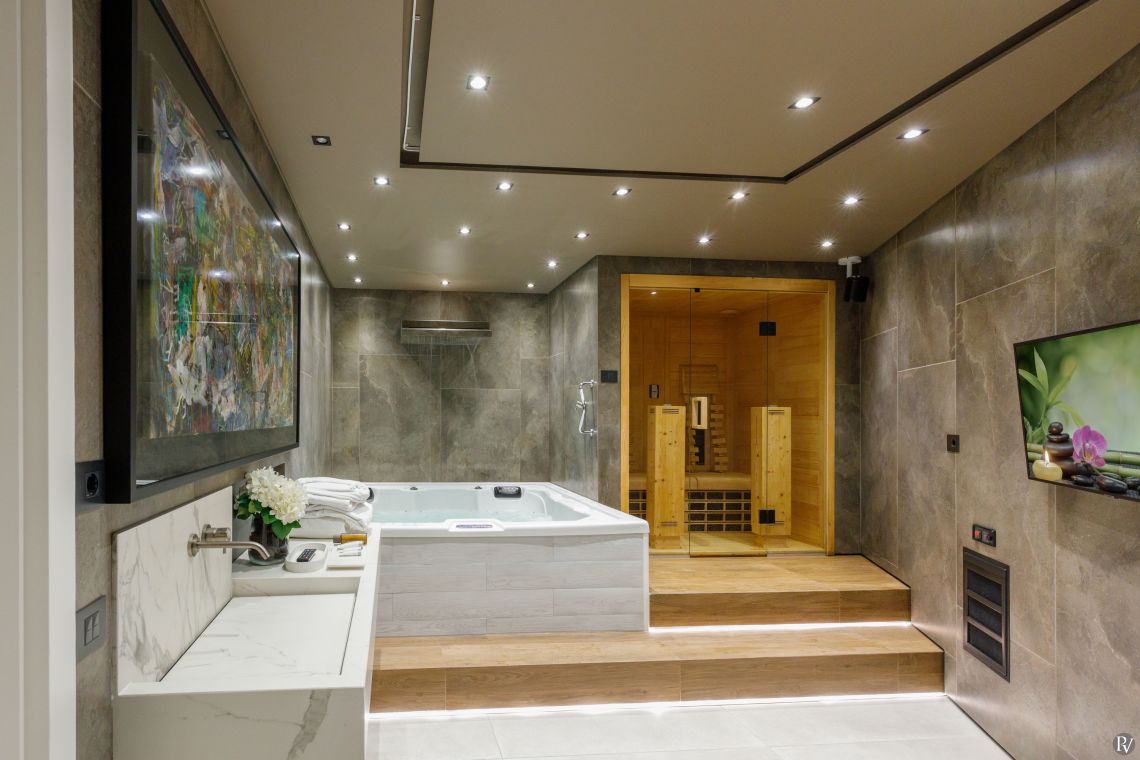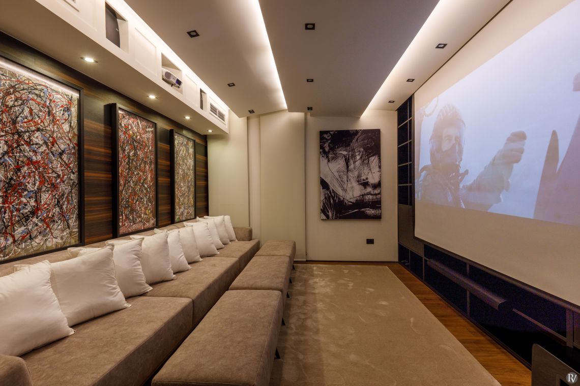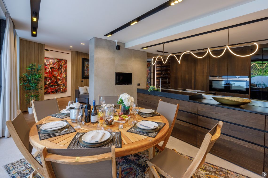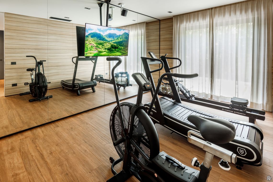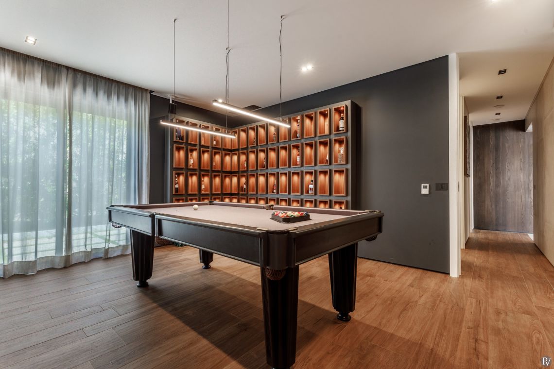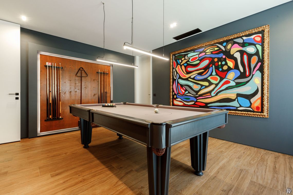 The villa includes a lounge area with a fireplace, a dining space seating up to 12, a fully equipped kitchen with a wine fridge and additional dining for six, as well as a pool table room, a cinema room, and a gym fitted with a running machine, bike, and rowing machine.