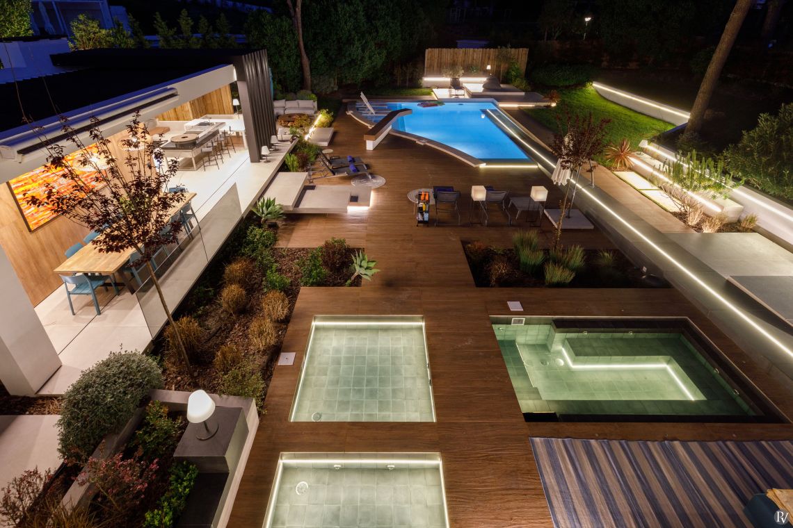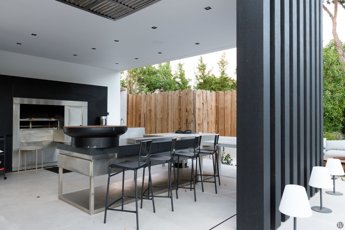 The outdoor space features a private swimming pool and jacuzzi, sun loungers, shaded al fresco dining areas with an outdoor fire pit, a fully equipped outdoor kitchen with a barbecue and secure parking.