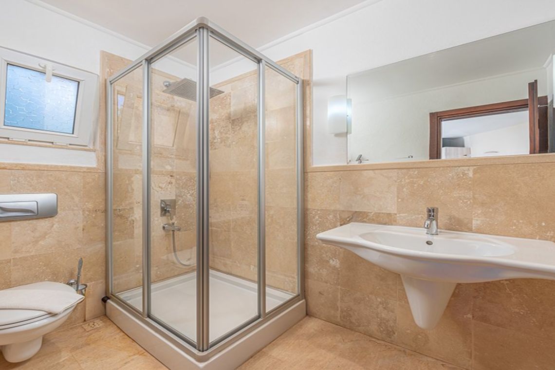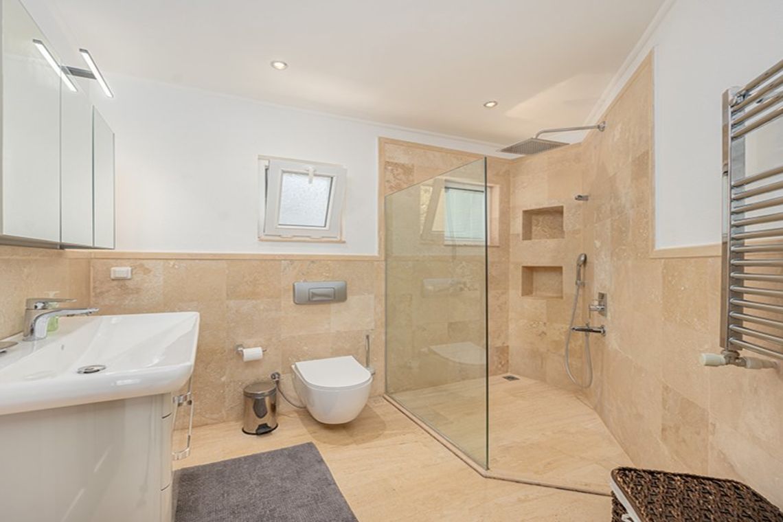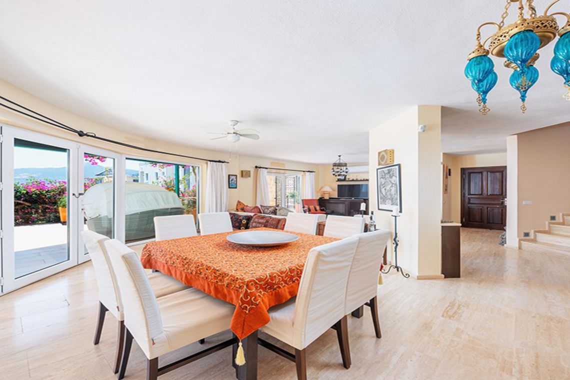 Indoors has tasteful modern décor with travertine flooring and dark-wood theme. Rooms are spacious and bright, with wall-length French windows on the ground floor and some first floor bedrooms. Air-conditioning units and radiators are effectively hidden, and the kitchen is a domestic haven with everything accounted for.