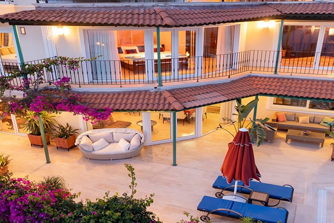A commodious summer triplex overlooking Kalamar Bay, Villa T2002 marries the comforts of modern living with understated Mediterranean charm. Think space, and lots of it. While most houses in Kalkan are built a tad close together, Villa T2102 enjoys relative privacy from its elevated perch on the corner of Yagmur Street. It boasts a splendid infinity pool which is not overlooked, as well as a kiddie pool with Jacuzzi feature. Nestled amidst bougainvillea and jasmine, and shaded by lime, olive and palm trees, the expansive pool terrace with covered al-fresco dining area, has fantastic views of the bay and islands.