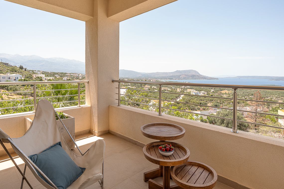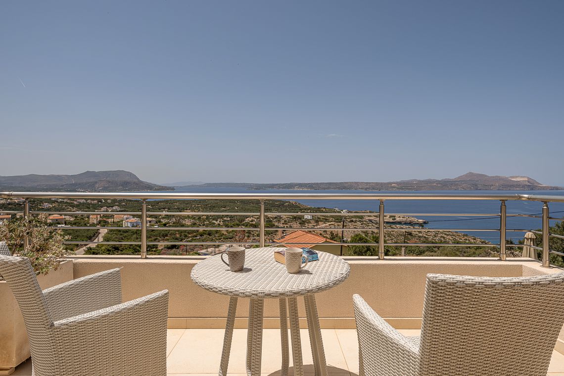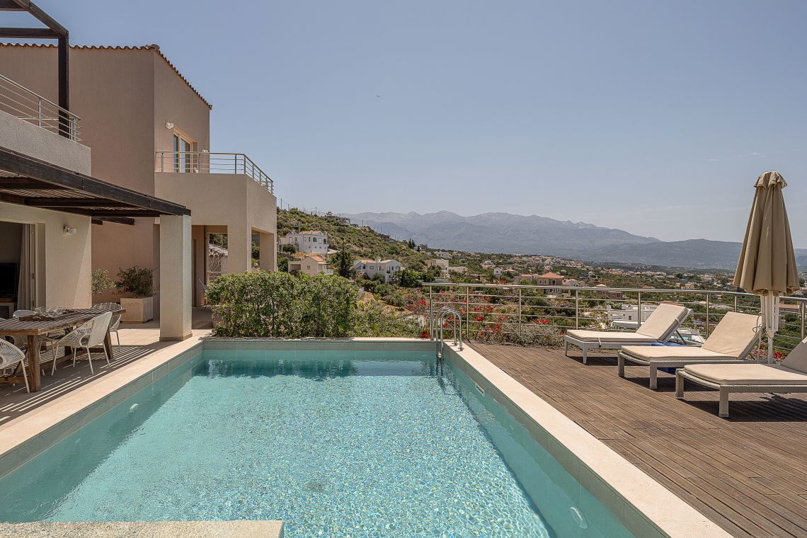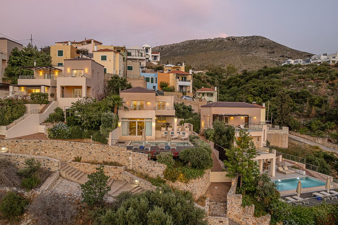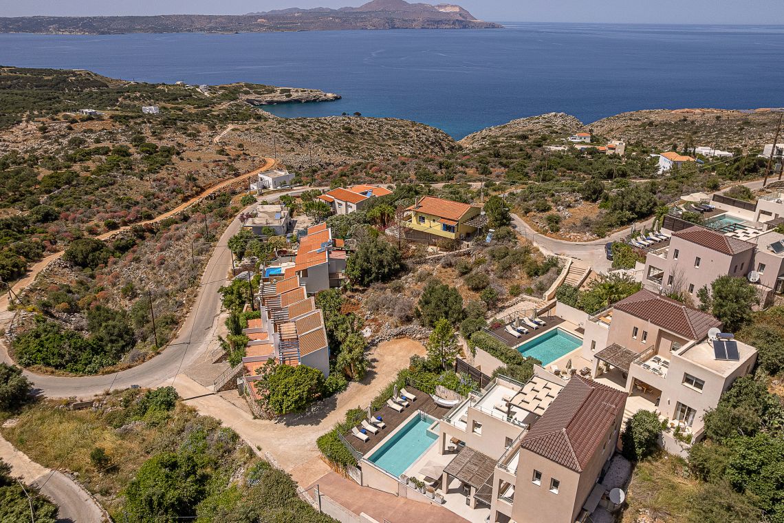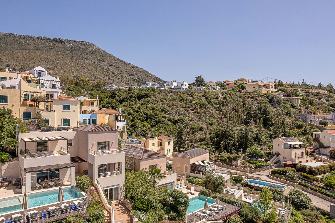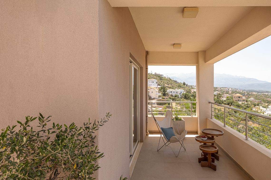 Aley is a 3 bedroom Premier Villas part of a newly completed estate located on the slopes of a hill outside of Chania, North Western Crete, Greece. The villa enjoys fabulous views of both the White Mountains on one side and blue expanse of Souda Bay, on the other.