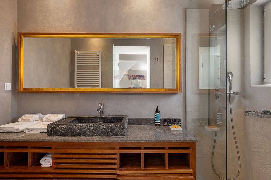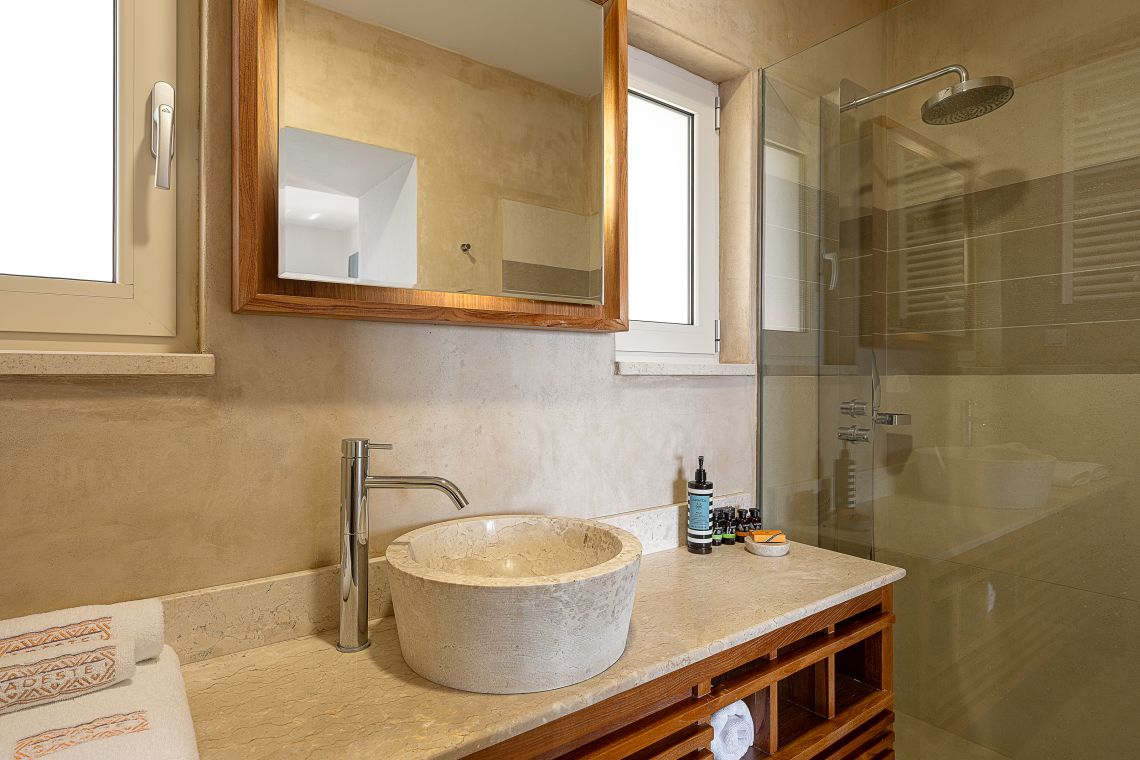 This villa's location is right on the outskirts of a typical Cretan village that offers tavernas and small markets for grocery shopping only a few steps away. The closest beach is a long walk (or short drive - 1.5k) away while the more famous Almyrida beach is only at 3k. The accommodation is on 2 floors, as follows: