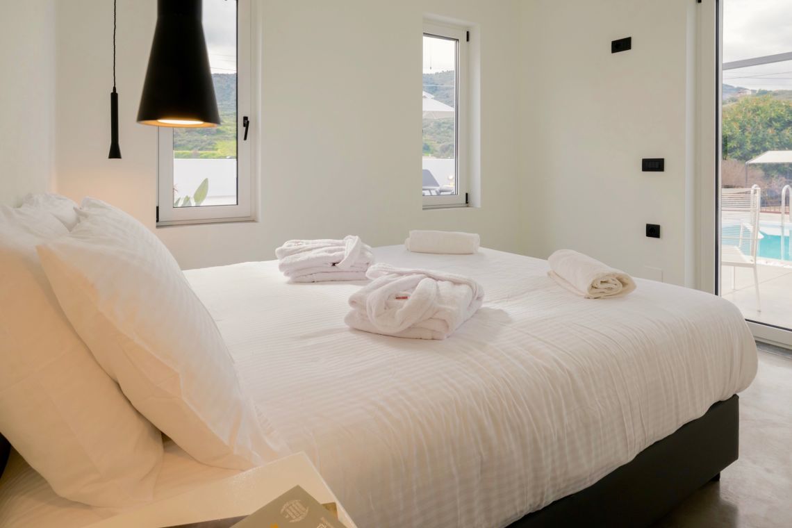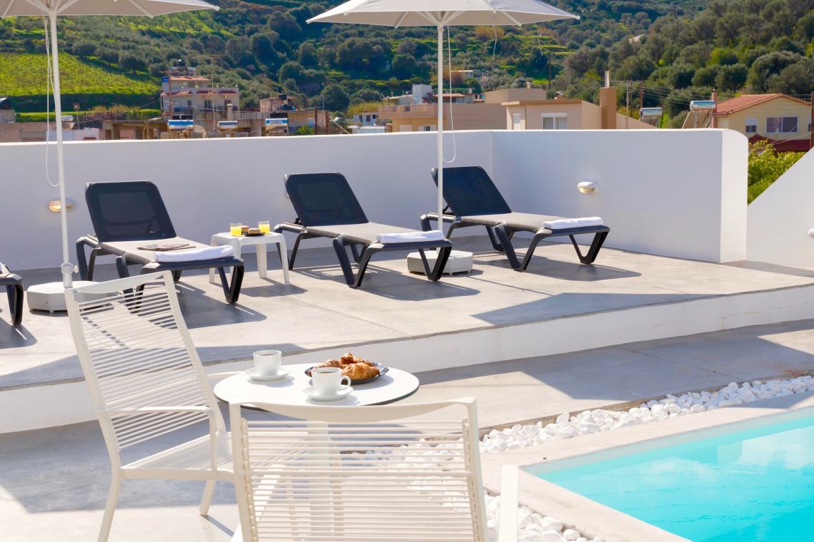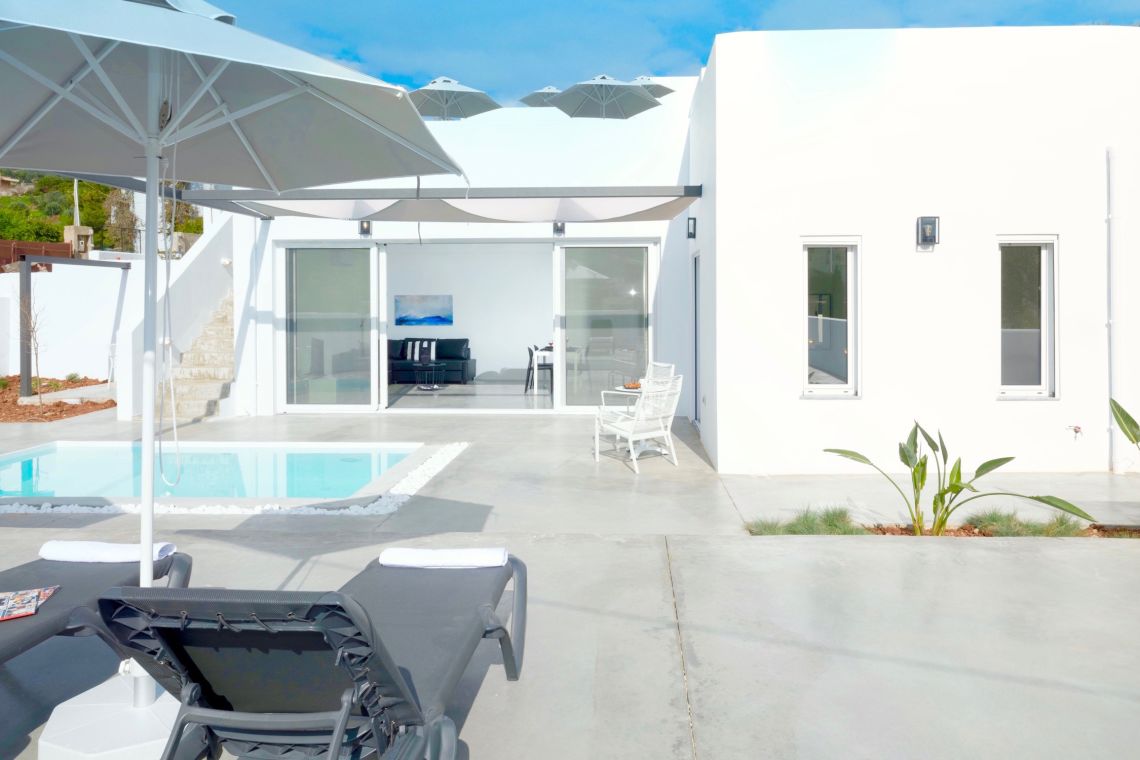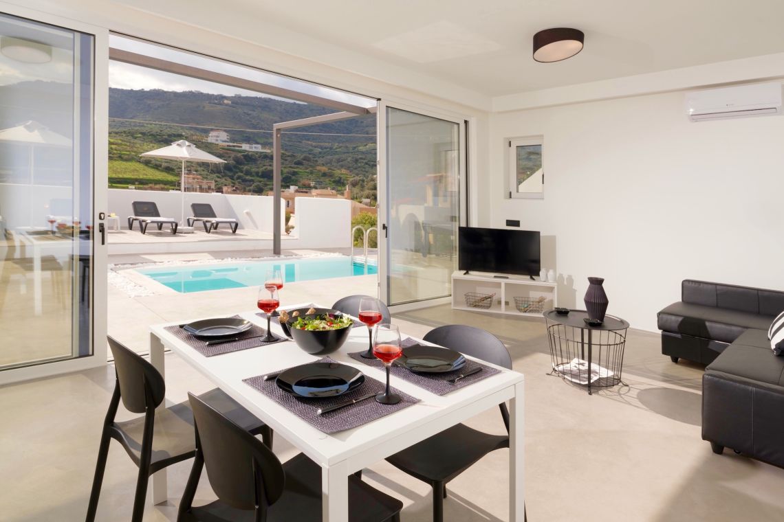 Outside, the villa is designed to embrace the Cretan sunshine, with a private swimming pool, sunbathing terrace, and alfresco dining area. Guests can enjoy panoramic views of the surrounding hills and countryside while relaxing or entertaining outdoors.