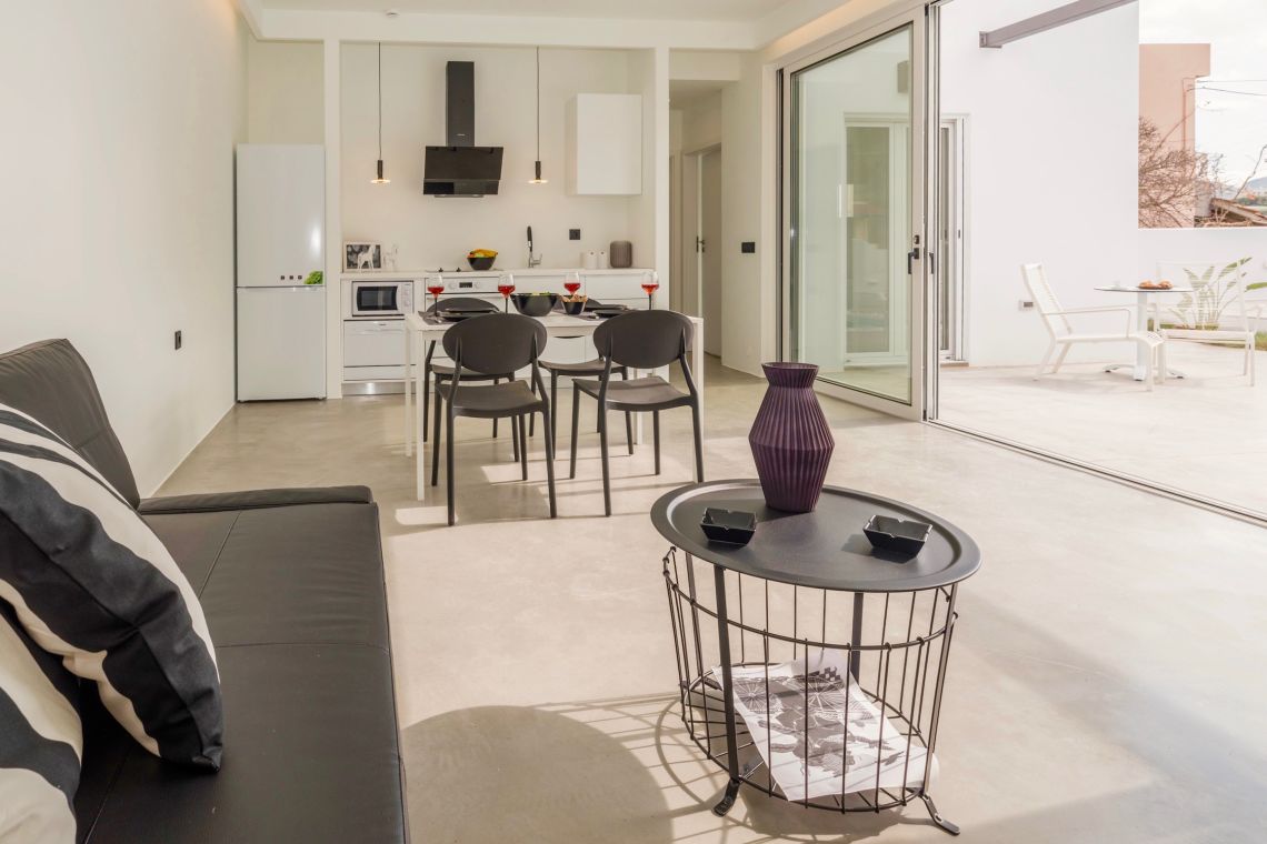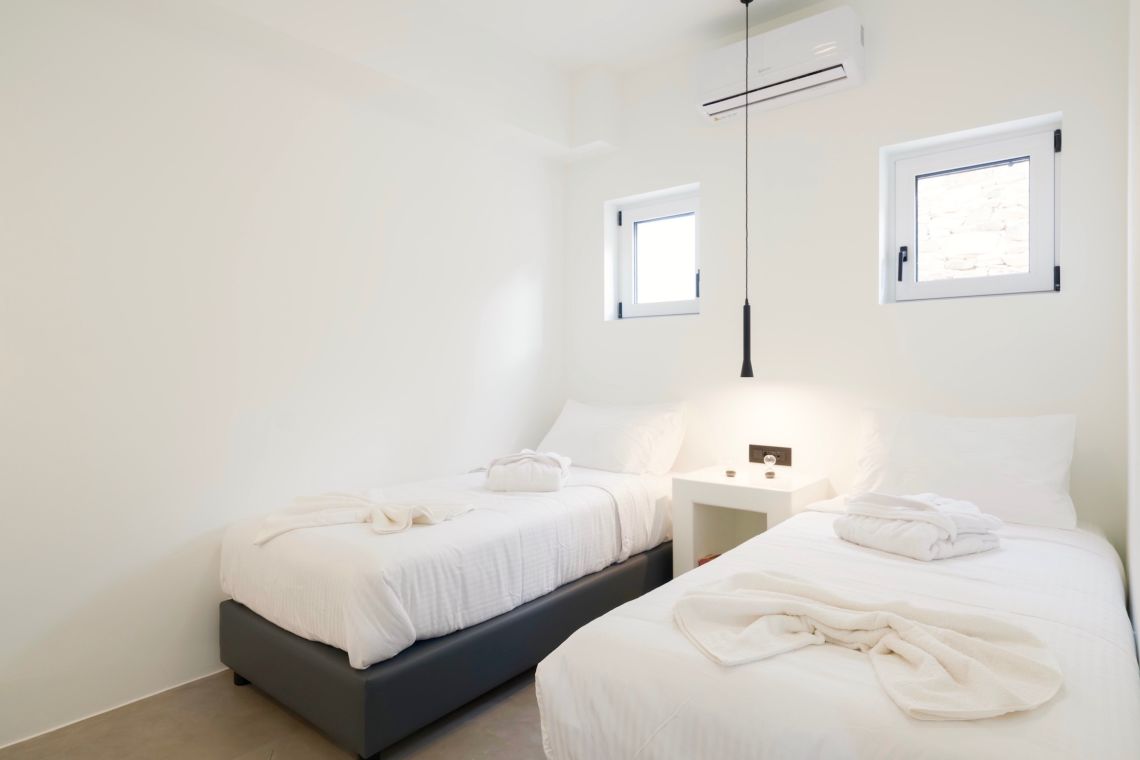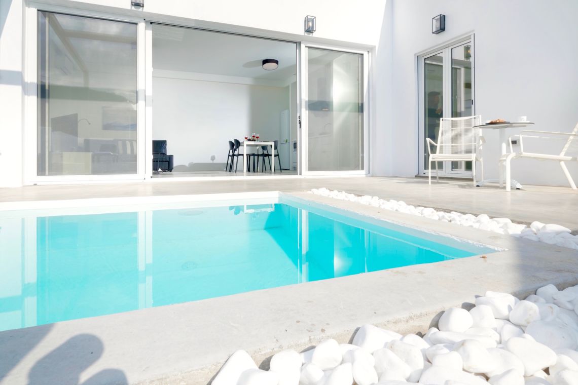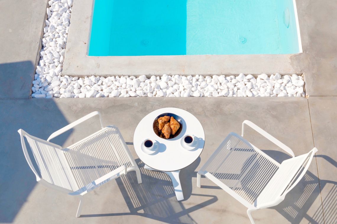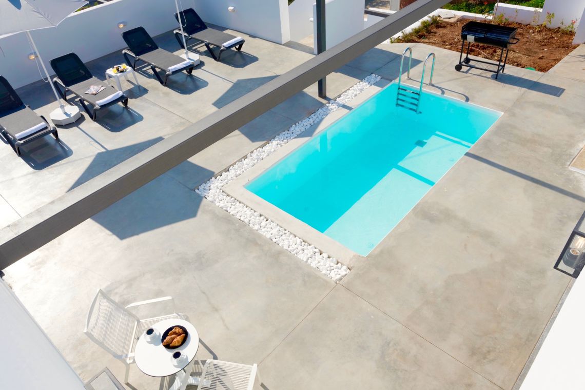 Outside, the villa is designed to embrace the Cretan sunshine, with a private swimming pool, sunbathing terrace, and alfresco dining area. Guests can enjoy panoramic views of the surrounding hills and countryside while relaxing or entertaining outdoors.