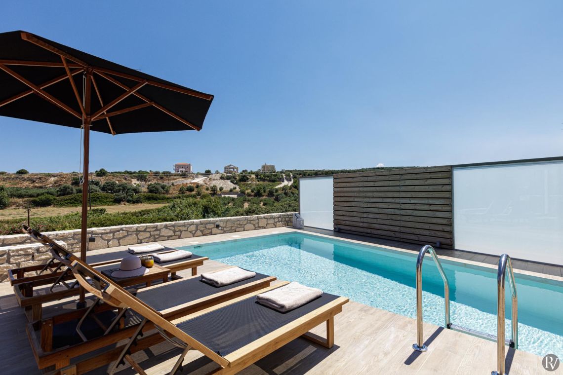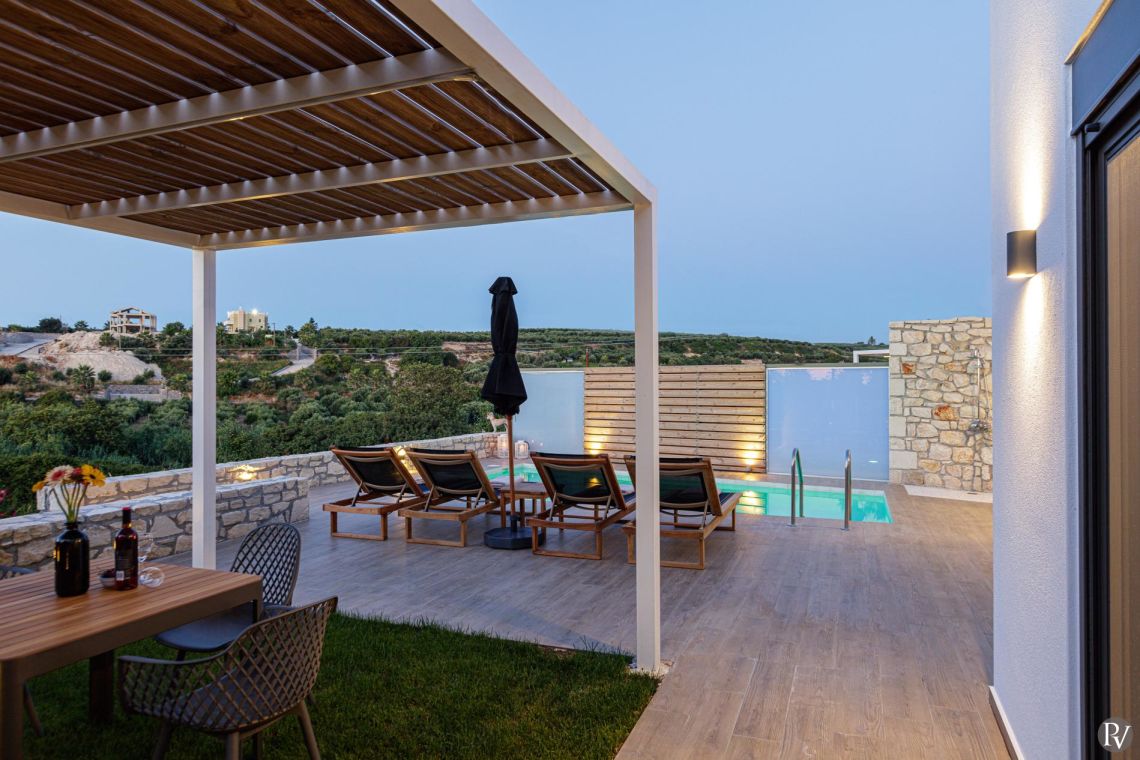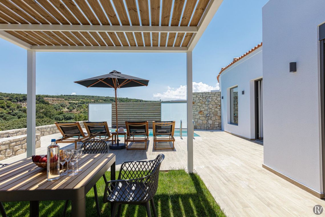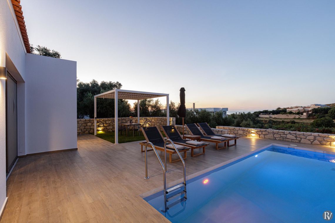 Guests can enjoy al fresco meals at the shaded BBQ area with dining for four, relax by the pool, or take advantage of the villa’s convenient location, just 500 m–1 km from the beach, restaurants, and supermarkets, with easy access to Heraklion (~72 km) and Chania (~77 km) airports.